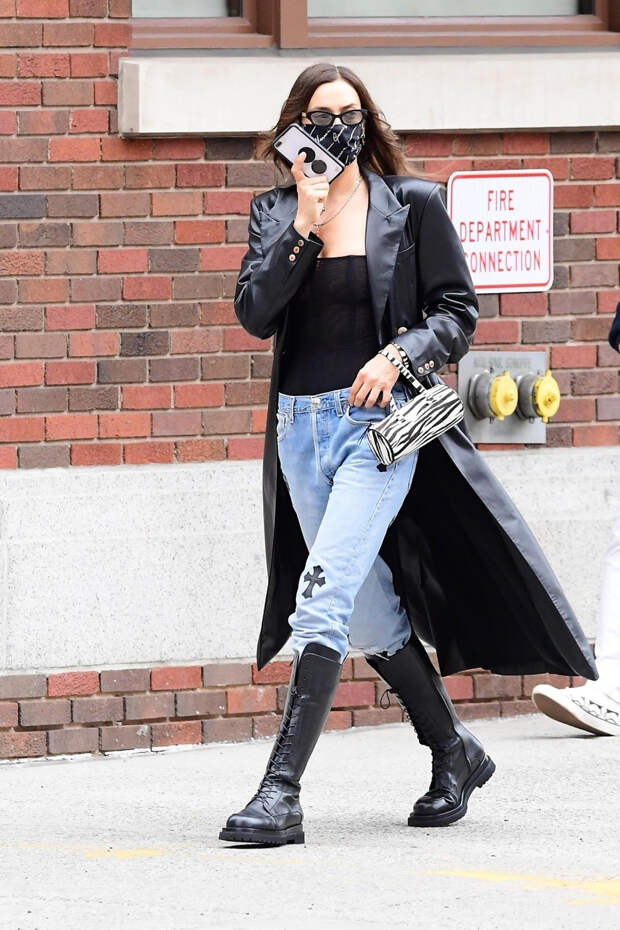 Разумеется, обойти это вниманием не смогла Ирина Шейк — популярная модель и известная фэшиониста. Недавно она появилась в луке, который явно косплеит Тринити из "Матрицы". Шейк надела длинный черный кожаный плащ, откровенный прозрачный корсет и гранжевые джинсы с готическими крестами. Дополнила свой образ модель высокими грубыми ботинками на шнуровке и очками в узкой оправе — совсем как у Тринити и Нео. И, конечно, маской — стиль стилем, а безопасность превыше всего.