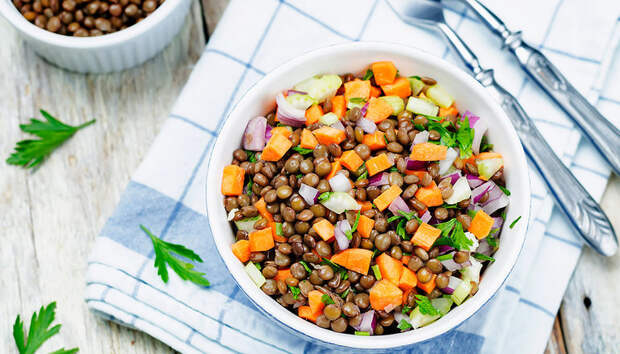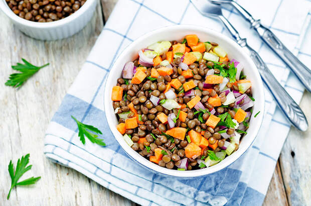 Чечевица на пару — это отличный способ восполнить запас белка — одна порция содержит около 18 грамм, а в качестве приятного бонуса — 16 грамм пищевых волокон. Можно добавить свежих овощей, приготовить соус из зелени или сделать вкус более интересным с помощью сушеных итальянских трав. А чтобы получить полноценный ланч, добавьте половинку авокадо и несколько столовых ложек тыквенных семечек.