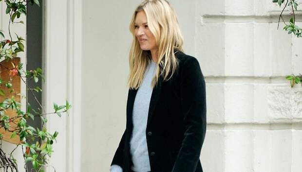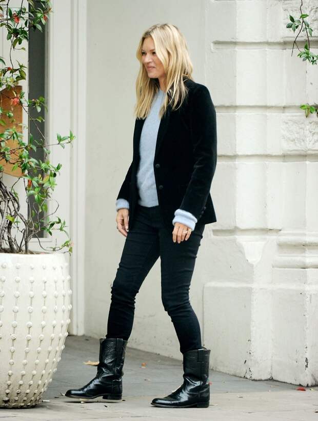 Кейт Мосс была замечена на прогулке по Лондону. Как и всегда в последнее время, топ-модель выглядела просто, но стильно: все ее недавние образы смело можно повторять этой осенью. На этот раз знаменитость надела простые черные джинсы скинни, удлиненный жакет и "ковбойские" сапоги в тон, и дополнила все это небесно-голубым свитером.