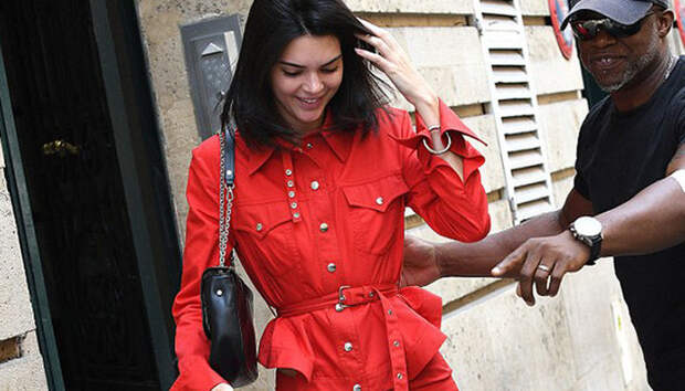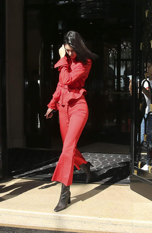 Будучи самой стильной девушка десятилетия, Кендалл Дженнер примеряет осенние тренды уже в середине лета. Супермодель прибыла в Париж, где сменила свои любимые велосипедки и безразмерные футболки на элегантный наряд: алый костюм, состоящий из укороченных расклешенных брюк и жакете с баской. Ботильоны с квадратным мысом дополнили образ.