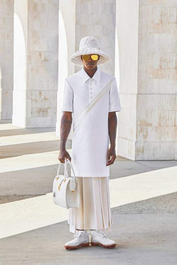 За вдохновением для своей новой коллекции дизайнер отправился... на Марс! Именно там, по его мнению, в 2132 году пройдут Олимпийские игры, как заявлено в видео-презентации коллекции (в этот раз Браун обошелся без традиционного зрелищного показа). И, конечно, кому-то нужно будет придумать одежду для атлетов. Почему бы не позаботиться об этом заранее? И пусть до события еще 121 год, зато мы уже знаем, как оно будет выглядеть. Во-первых, все спортсмены будут в белом — ведь это цвет надежды на светлое будущее, в котором эти игры и пройдут. Во-вторых, силуэты их одежды будут отсылать к 30-м: это будут прямые платья, плиссированные юбки, укороченные брюки, широкополые шляпы-котелки и угловатые пиджаки. И, наконец, спортсменов через 121 год не будут беспокоить такие мелочи, как гендер. И мужчины, и женщины будут спокойно и с удовольствием носить одни и те же вещи, включая юбки и платья. В конце концов, разве это как-то влияет на спортивные достижения? И разве на Марсе кому-то есть какое-то дело до наших земных предрассудков?