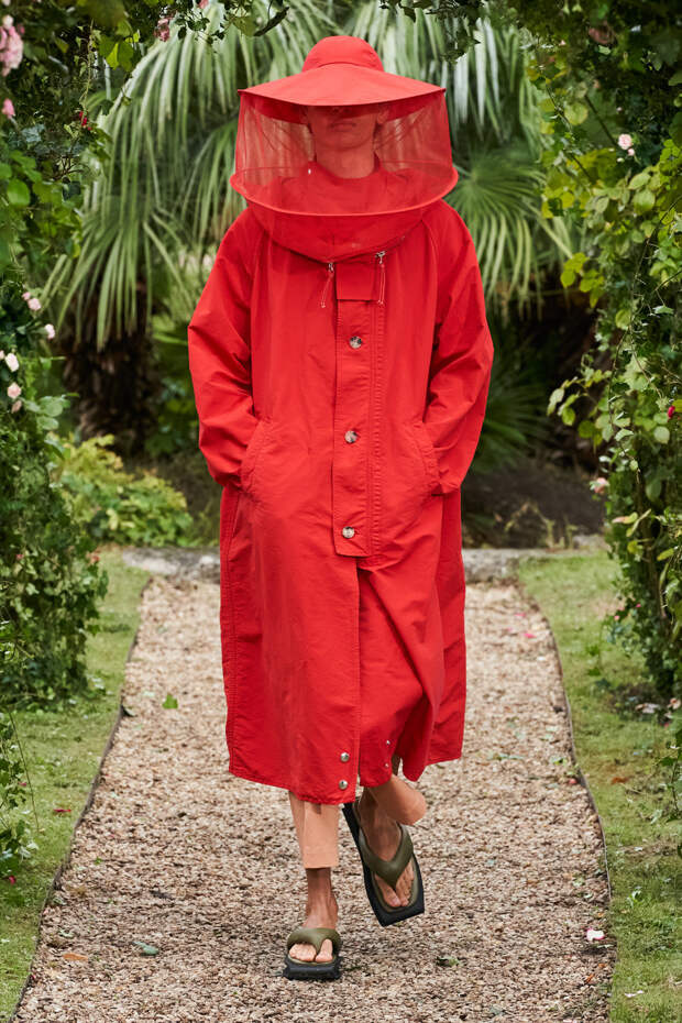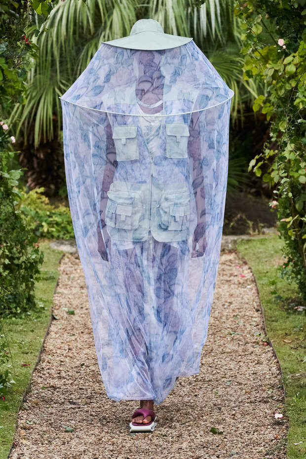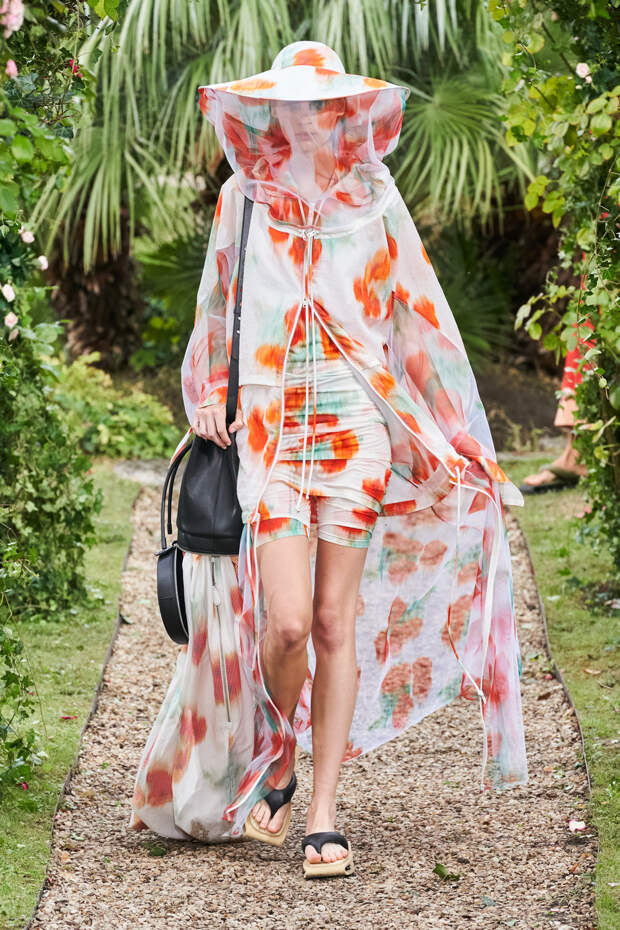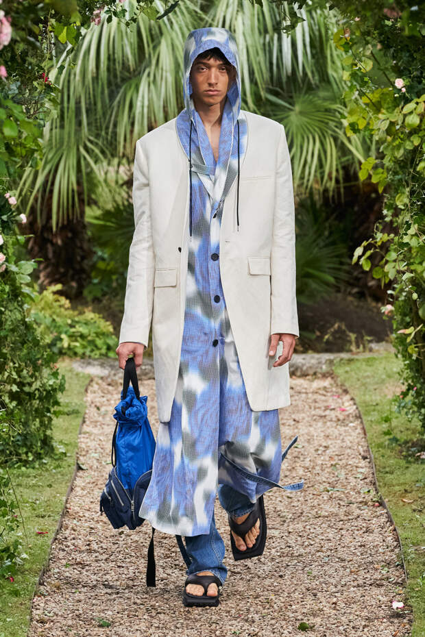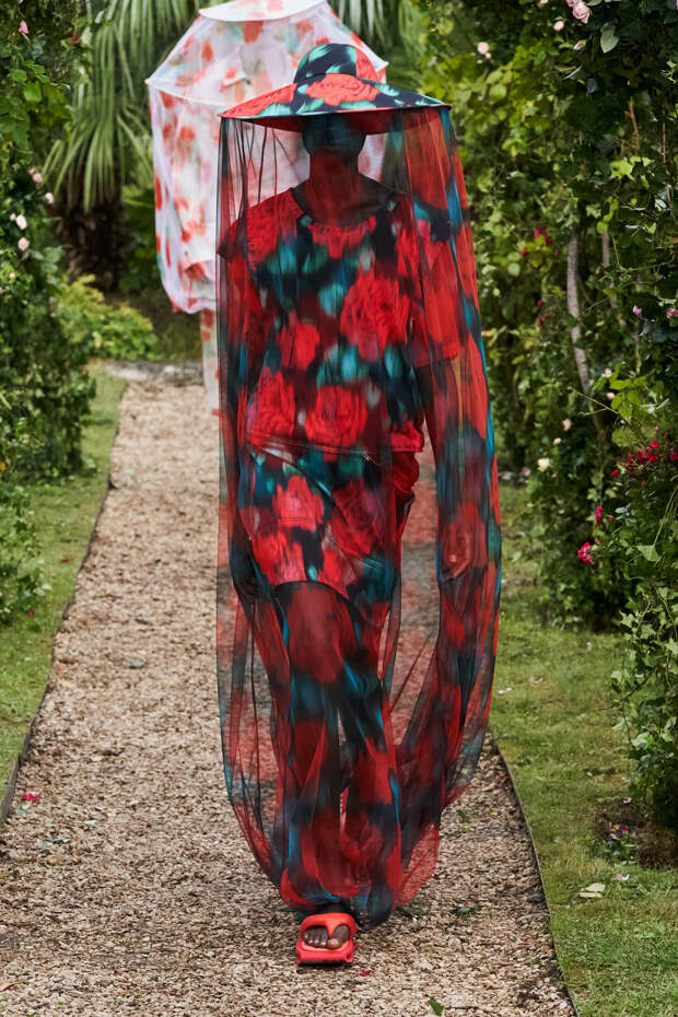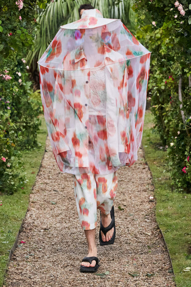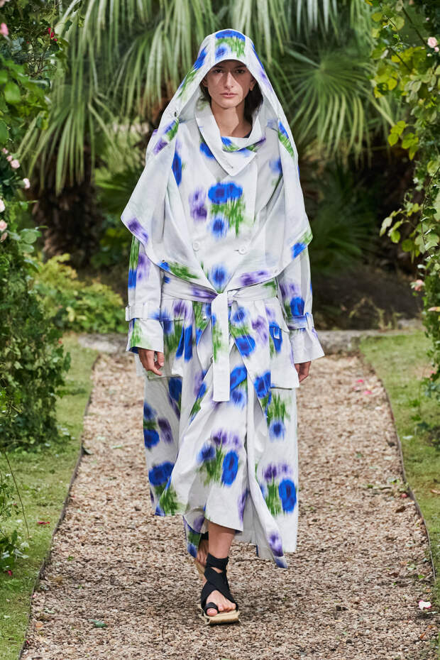 Так, в части луков были повторены архивные принты с маками и гортензиями — но в измененном виде. Посчитав, что легкомысленные и романтичные цветочные мотивы не слишком соответствуют духу времени, Фелипе Оливейра Батишта сделал их несколько расплывчатыми: "Мир плачет, а с ним — и принты, которые мы придумали для коллекции. Архивным макам и гортензиям Kenzo мы придали "плачущий" вид с помощью диджитал-эффектов". Не обошел он стороной и японские корни бренда (Кензо Такада переехал в 1965 году в Париж из Токио). Отсюда в коллекции появились японские сандалии гэта на массивной деревянной подошве — и это не только оммаж истории, но и еще один метафорический способ дистанцироваться от окружающего мира и его проблем, "возвысившись" над ними. В целом новые вещи Kenzo вышли такими, будто они хотят накрыть и защитить своего носителя подобно кокону. В нынешних не самых радужных реалиях — очень важное и приятное свойство.