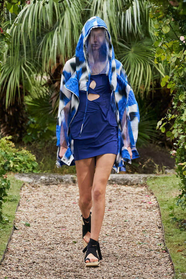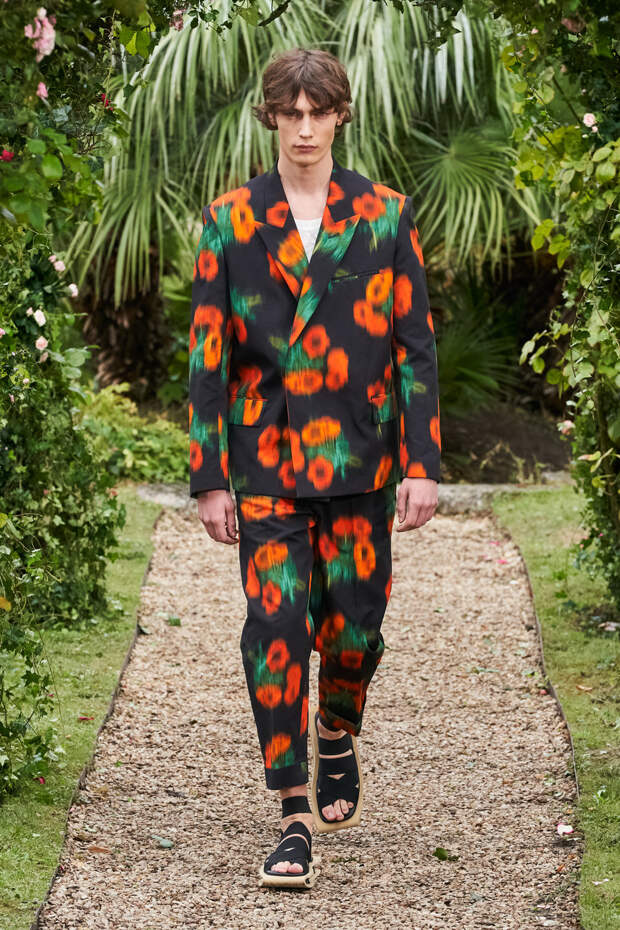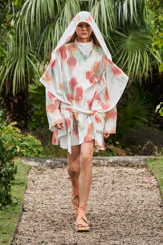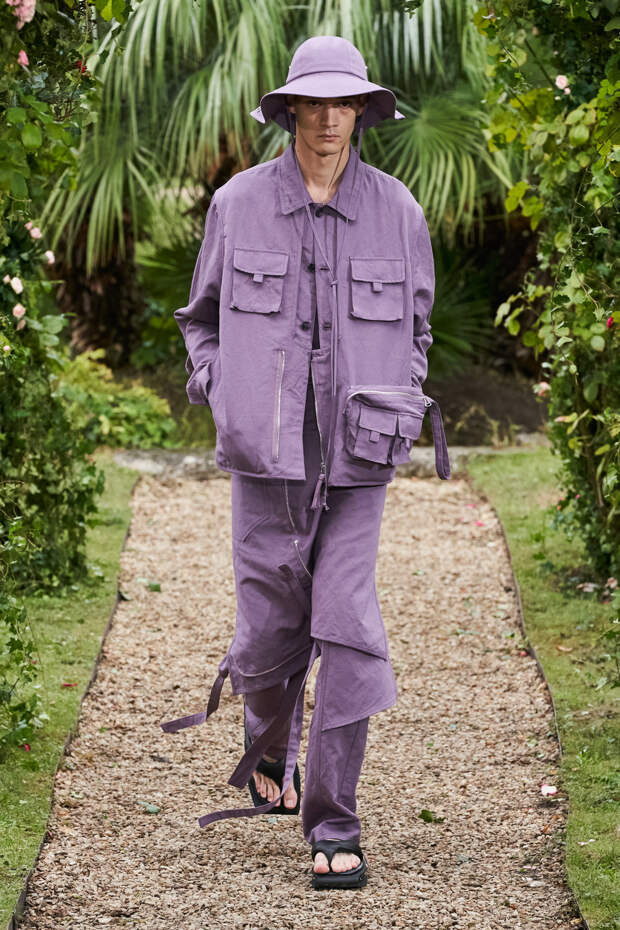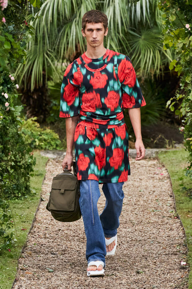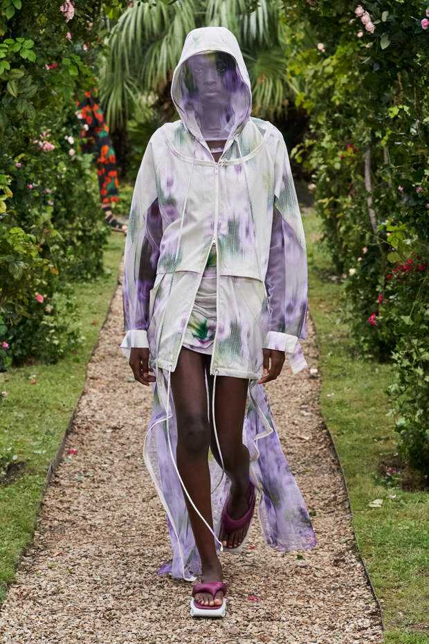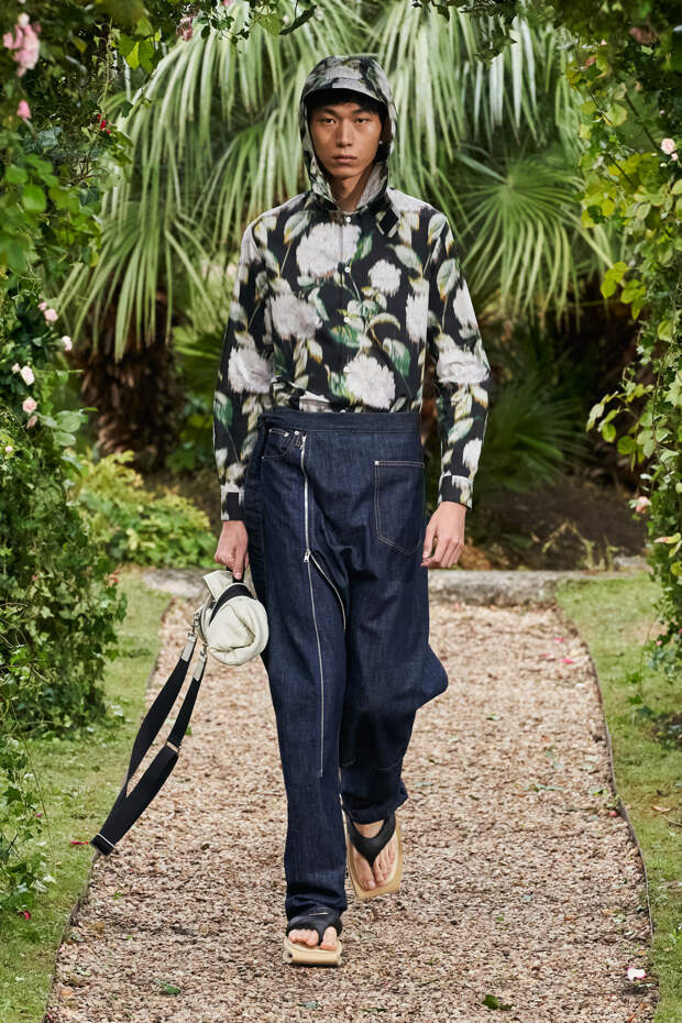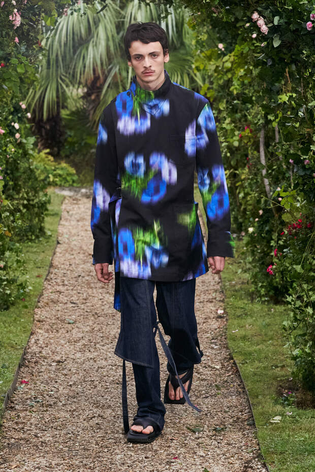 Так, в части луков были повторены архивные принты с маками и гортензиями — но в измененном виде. Посчитав, что легкомысленные и романтичные цветочные мотивы не слишком соответствуют духу времени, Фелипе Оливейра Батишта сделал их несколько расплывчатыми: "Мир плачет, а с ним — и принты, которые мы придумали для коллекции. Архивным макам и гортензиям Kenzo мы придали "плачущий" вид с помощью диджитал-эффектов". Не обошел он стороной и японские корни бренда (Кензо Такада переехал в 1965 году в Париж из Токио). Отсюда в коллекции появились японские сандалии гэта на массивной деревянной подошве — и это не только оммаж истории, но и еще один метафорический способ дистанцироваться от окружающего мира и его проблем, "возвысившись" над ними. В целом новые вещи Kenzo вышли такими, будто они хотят накрыть и защитить своего носителя подобно кокону. В нынешних не самых радужных реалиях — очень важное и приятное свойство.