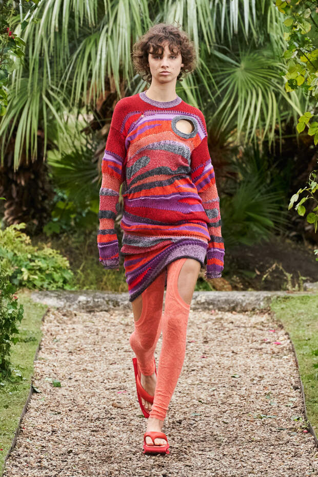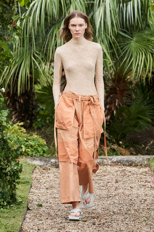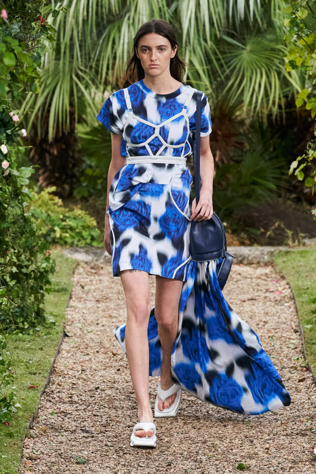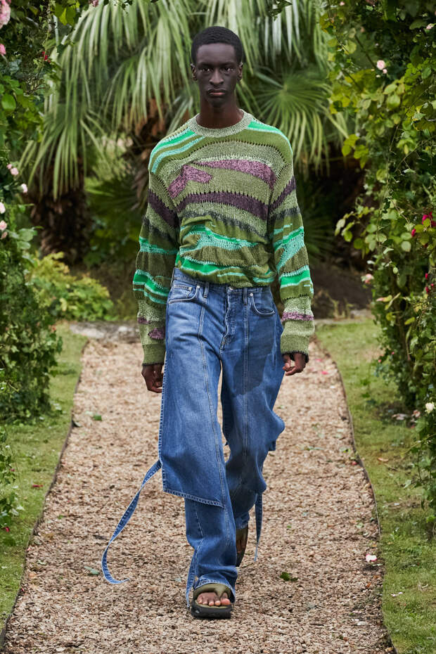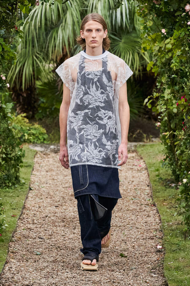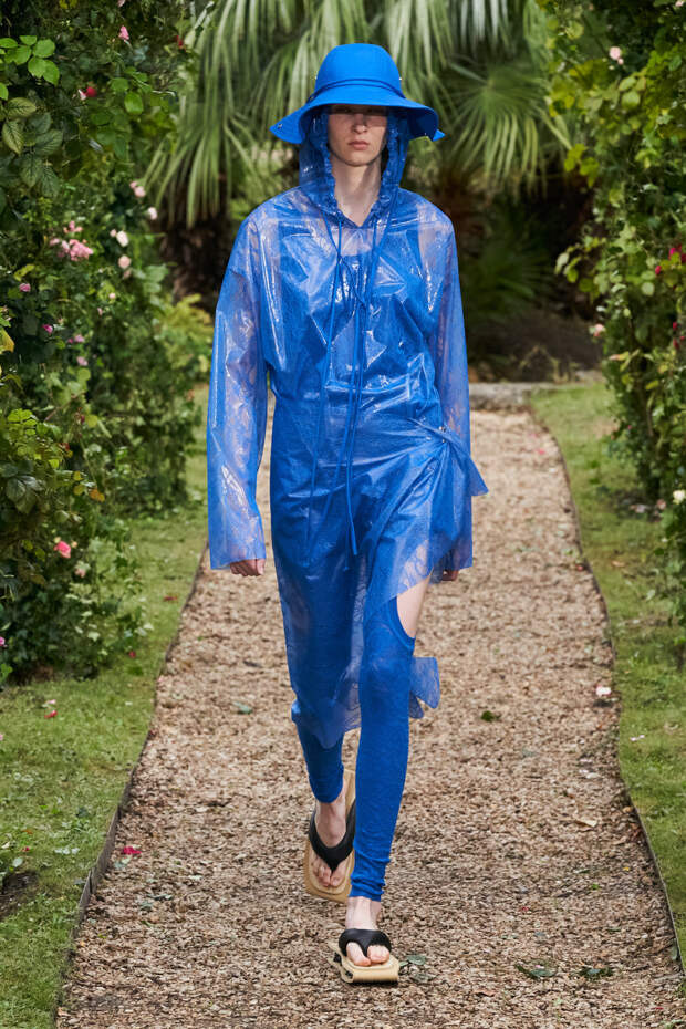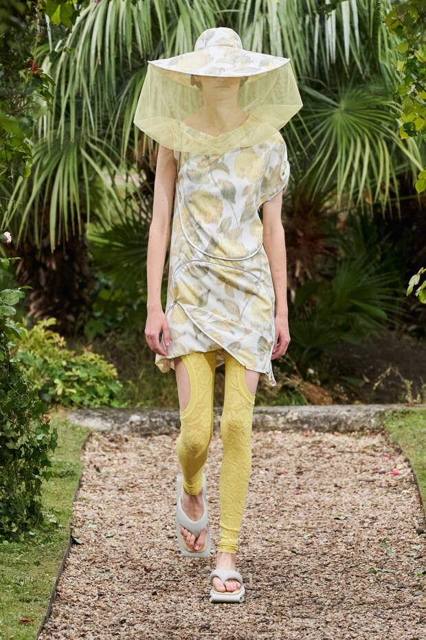 Так, в части луков были повторены архивные принты с маками и гортензиями — но в измененном виде. Посчитав, что легкомысленные и романтичные цветочные мотивы не слишком соответствуют духу времени, Фелипе Оливейра Батишта сделал их несколько расплывчатыми: "Мир плачет, а с ним — и принты, которые мы придумали для коллекции. Архивным макам и гортензиям Kenzo мы придали "плачущий" вид с помощью диджитал-эффектов". Не обошел он стороной и японские корни бренда (Кензо Такада переехал в 1965 году в Париж из Токио). Отсюда в коллекции появились японские сандалии гэта на массивной деревянной подошве — и это не только оммаж истории, но и еще один метафорический способ дистанцироваться от окружающего мира и его проблем, "возвысившись" над ними. В целом новые вещи Kenzo вышли такими, будто они хотят накрыть и защитить своего носителя подобно кокону. В нынешних не самых радужных реалиях — очень важное и приятное свойство.