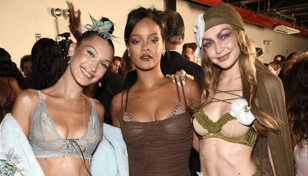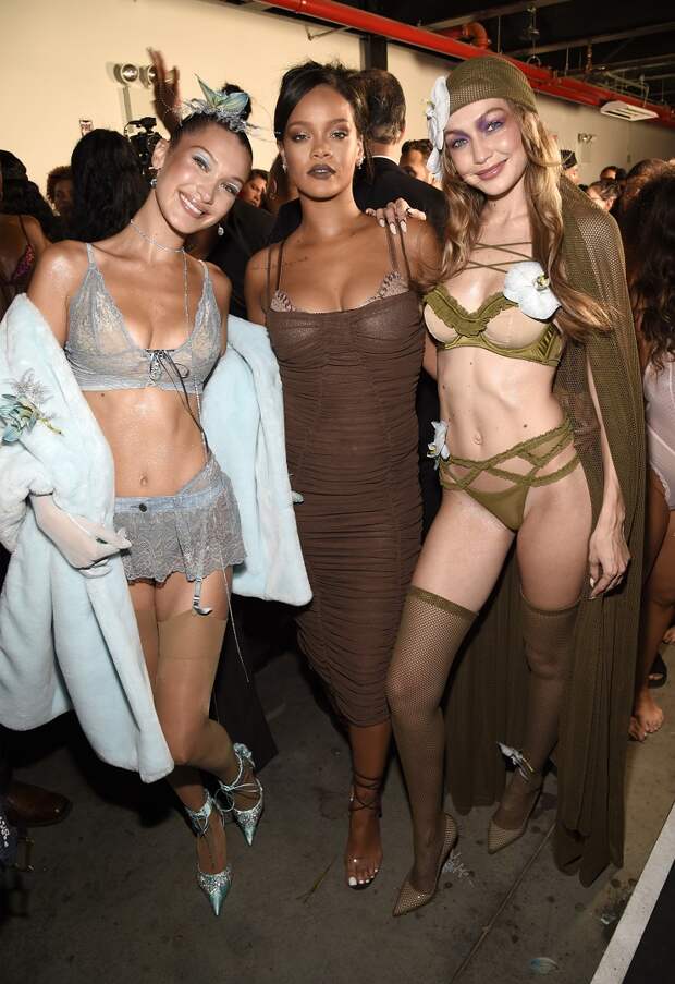 Рианне можно все! И даже больше. Именно поэтому сестры Хадид, на протяжении всей Недели моды в Нью-Йорке не обнажившиеся ни на одном из показов, сделали это именно на Fenty Puma by Rihanna. Девушки вышли на подиум в кружевных комплектах нижнего белья авторства поп-дивы. Их образы дополняли длинные накидки - из шифона у Джиджи, из меха у Беллы.