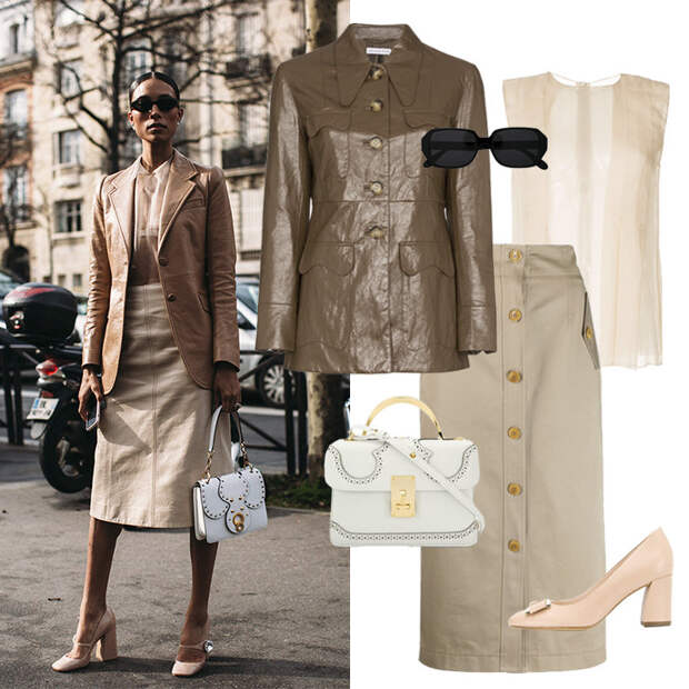 Блузка ABADIA, 24 146 руб.; юбка GIVENCHY, 59 210 руб.; куртка REJINA PYO, 38 846 руб.; очки RETROSUPERFUTURE, 13 485 руб.; сумка THE VOLON, 39 402 руб.; туфли HOGL, 6 358 руб.