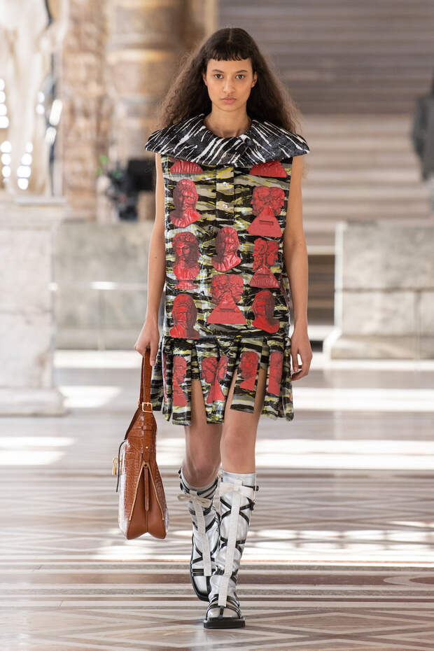За день до показа команда Дома заинтриговала гостей пригласительными: они обещали коллаборацию с Fornasetti. Культовые тарелки с лицами авторства художника и декоратора Пьеро Форназетти давно уже стали настоящими объектами желания — тем удивительнее, что ни один модный бренд ранее не догадался сделать с ними что-то совместное. Идея, в общем-то, лежала на поверхности — но заметил ее только Николя Жескьер. Теперь фанаты знаменитой фабрики могут носить изображения самых фотогеничных тарелок инстаграма прямо на себе — в качестве сумок, курток, платьев и жакетов. Правда, команда французского Дома решила не идти самым очевидным путем: вместо знаменитого портрета оперной дивы Лины Кавальери они взяли профили с античных барельефов и монет. И решили продолжить тему античности также и в силуэтах.