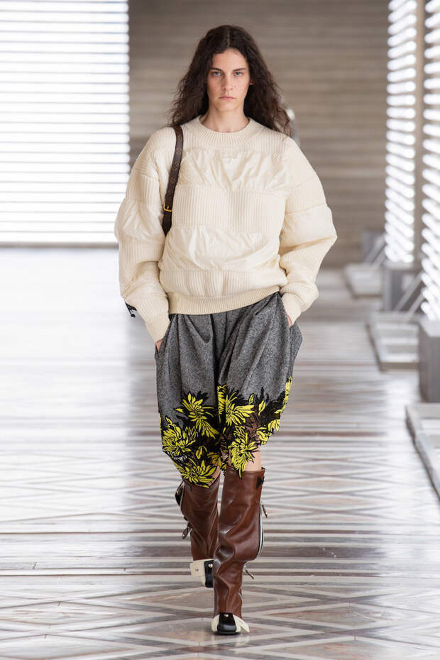 Еще одна знаковая вещи в коллекции — "дутые" кейпы-пуховики, напоминающие плащи все тех же легионеров. И это, с одной стороны, небанальное прочтение темы пуховиков (обойтись без них зимой не выйдет — будем пытаться хотя бы как-то разнообразить), а с другой — еще один выход, если очень хочется поддержать "гладиаторский" тренд.