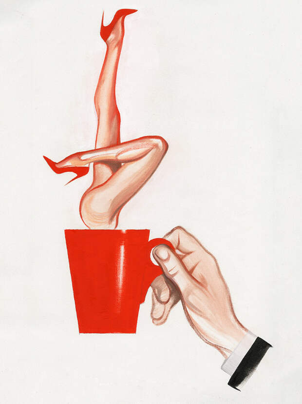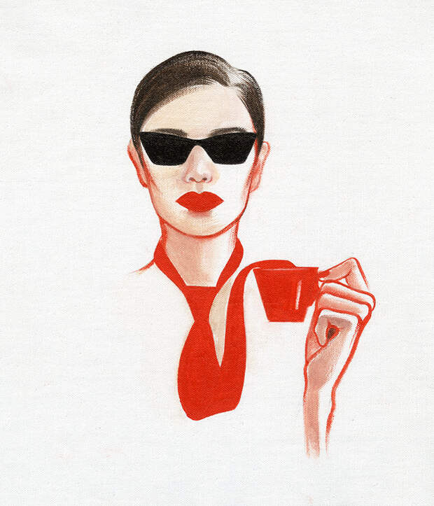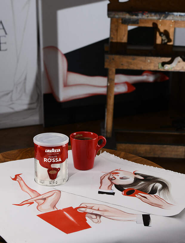Пока я думала над лирической частью нашего сотрудничества с Lavazza, собираясь строить весь творческий процесс сугубо на «итальянском образе жизни» и красном цвете, до меня доехала прекрасная красная чашка. Казалось бы: чашка — это очень банальный объект, которым невозможно вдохновиться, но меня осенило в тот момент, что я хочу построить весь свой художественный замысел вокруг этой чашки. И так родилось три принта, условно: утренний, дневной и вечерний. Героиня нашего принта — это, конечно, девушка Маши Янковской, та же что и на всех других картинах. В принципе, она и есть я. Конкретно в этих принтах я сделала ей темные волосы, чтобы была отсылка к итальянкам.