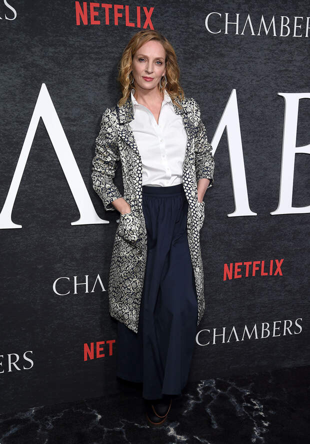 Хотя Ума Турман на десять лет младше Джулианны Мур, муза Квентина Тарантино выбирает не столько смелые образы для красных дорожек. Но от этого не менее элегантные: 48-летняя Ума представила в Нью-Йорке новый сериал Chambers, снятый по заказу Netflix. Турман предстала перед собравшимися в просторной юбке из темно-синего хлопка, белоснежной сорочке и легком пальто с восточным орнаментом, а завершили образ черные кожаные ботильоны с коричневой окантовкой и тонкие серьги-хулахупы.