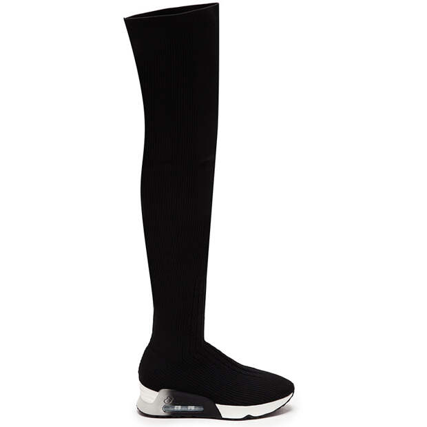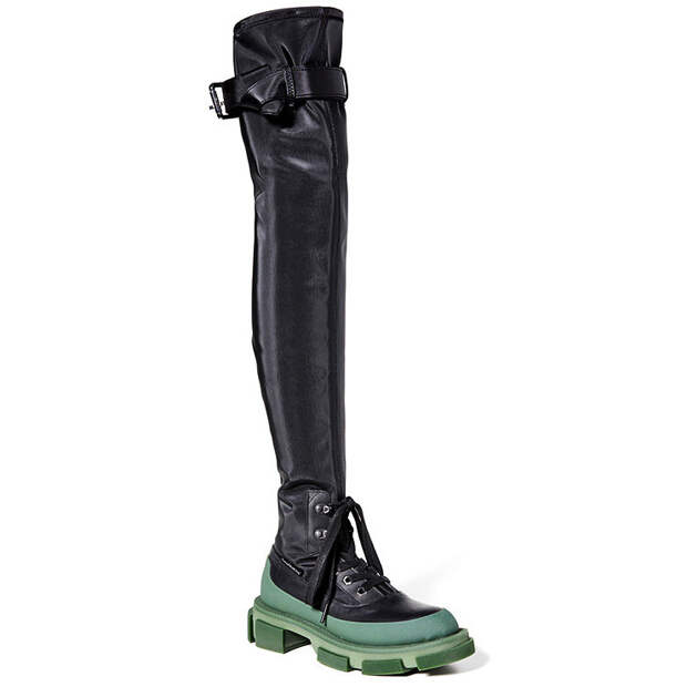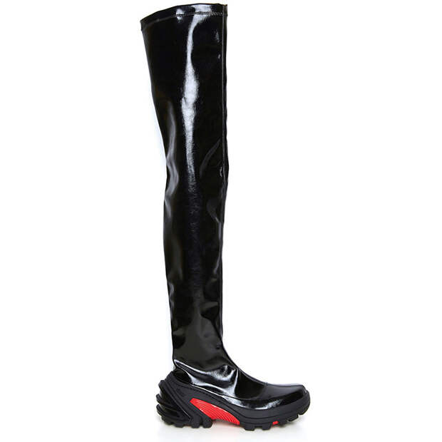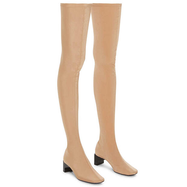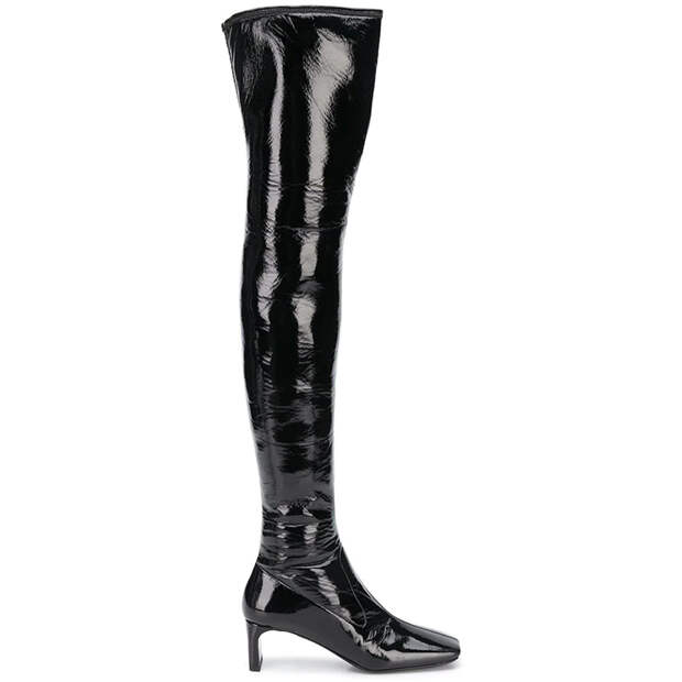 Против лакового покрытия и острых носов мы все-таки ничего не имеем. Поэтому включили в подборку и такой вариант — ботфорты Prada с небольшим, оставленным к самому краю пятки тонким каблуком. Но в основном присмотритесь все-таки к высоким сапогам на плоской подошве — или с каблуком тоже невысоким, но более устойчивым. Например, квадратным в духе 60-х, ведь такие модели не выходят из моды уже который год. Ну а лучше всего — по крайней мере интересней — смотрятся “гибридные” пары, в которых классические высокие сапоги скрещены с еще какой-нибудь обувью. Чаще всего — с кроссовками, но это не единственный вариант. Посмотрите на роскошную пару Monse: низ этих изящных сверху ботфорт выглядит как тяжелые туристические ботинки.