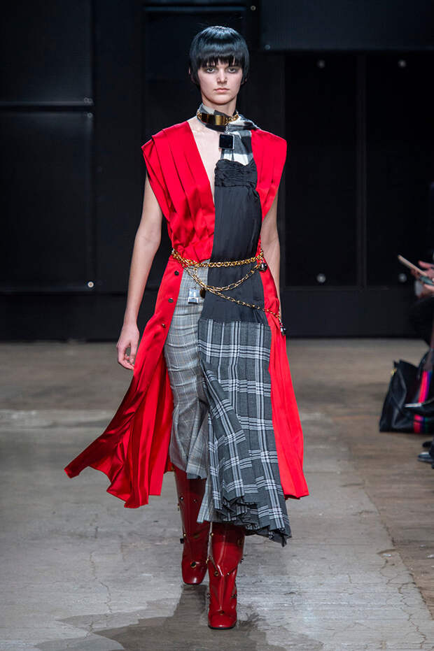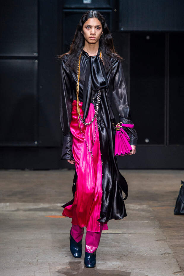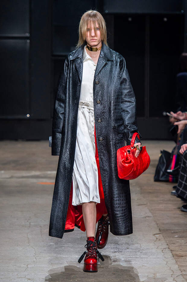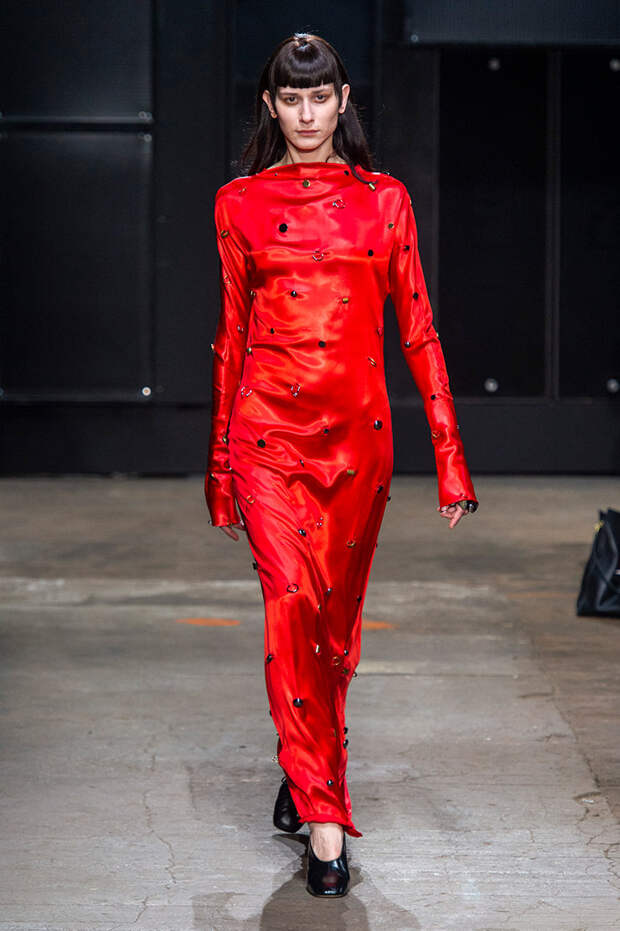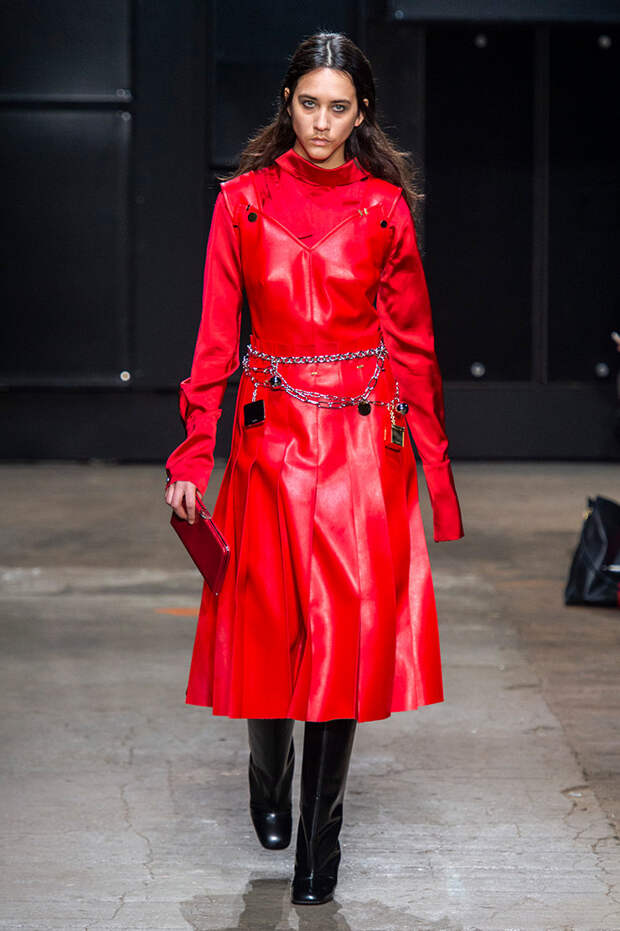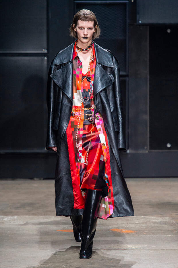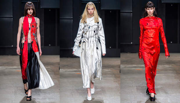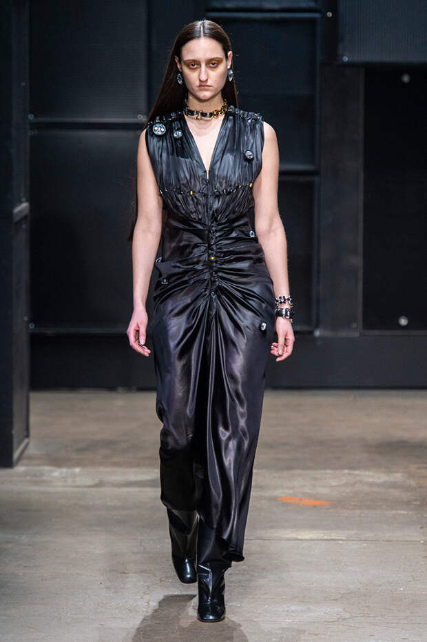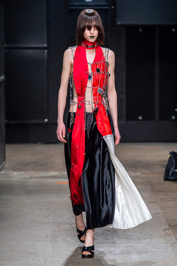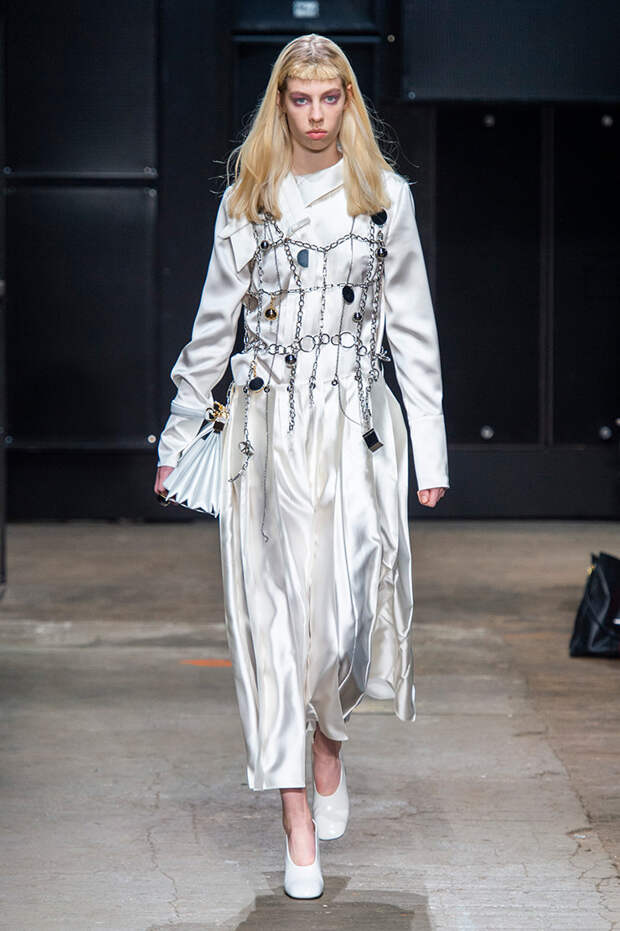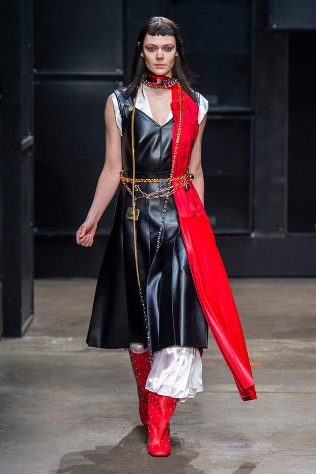 Мы же ограничимся основными тэгами: эротика, гормоны, борьба за сексуальную свободу как еретичество, противостояние рационального и чувственного, «карта точек удовольствия».Да, это еще одна коллекция, исследующая человеческую — в первую очередь женскую — сексуальность. В некотором роде более предсказуемая, чем у Симон Роша, в Лондоне работавшей с той же темой, и, тем более, чем у Кристофера Кейна. Риссо использовал и БДСМ-отсылки, и будуарную эстетику — все визуальные элементы, которые традиционно достаются наружу, когда нужно показать секс. Но банальной и скучной ее не назовешь никак. Здесь нет вызывающе глубоких декольте, "неожиданных", а на самом деле очевидных разрезов — это все было бы совсем не в духе странного, всегда на своей волне дома Marni.