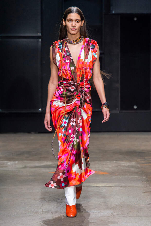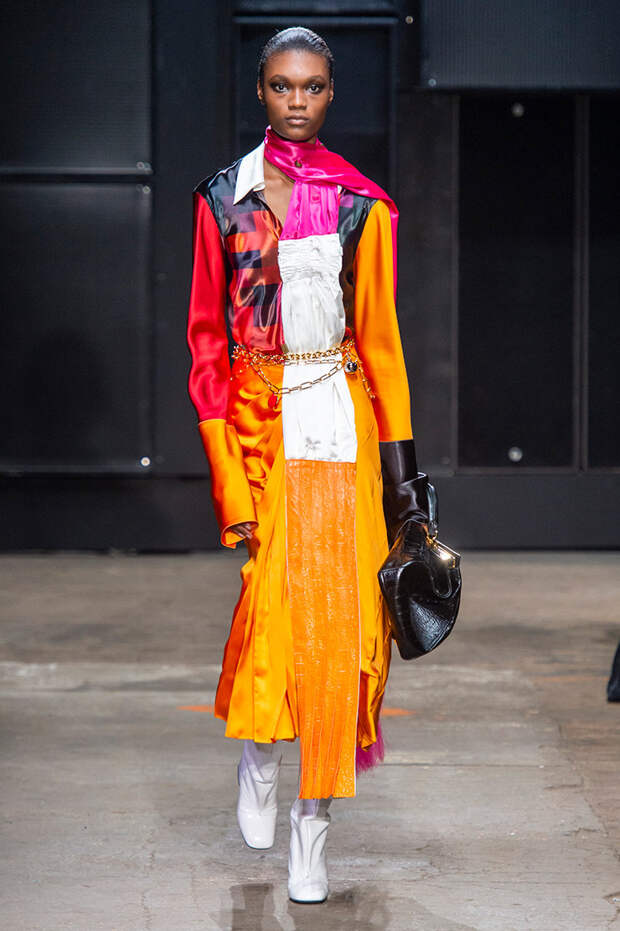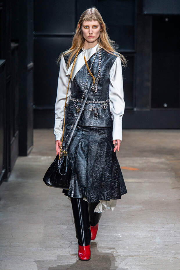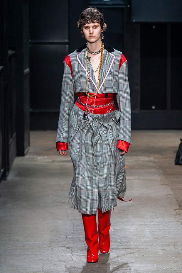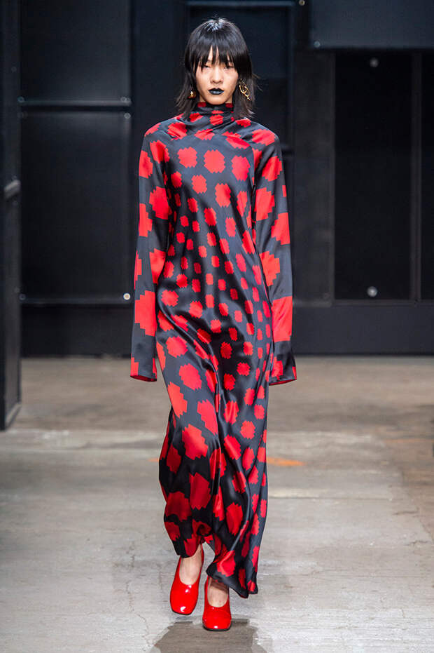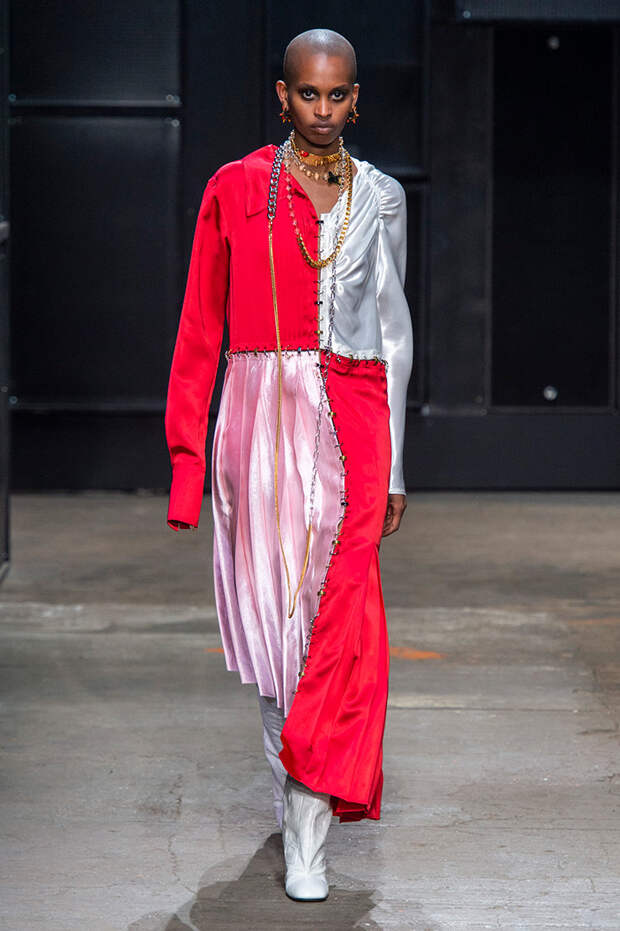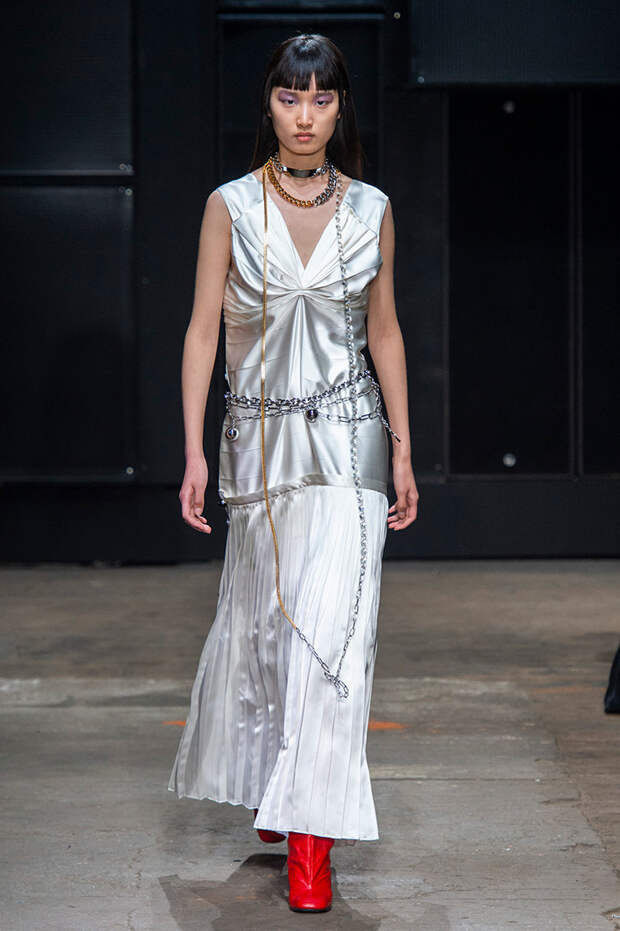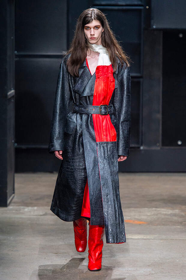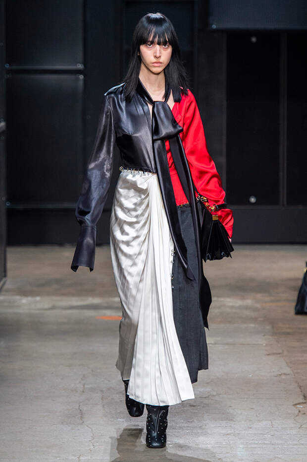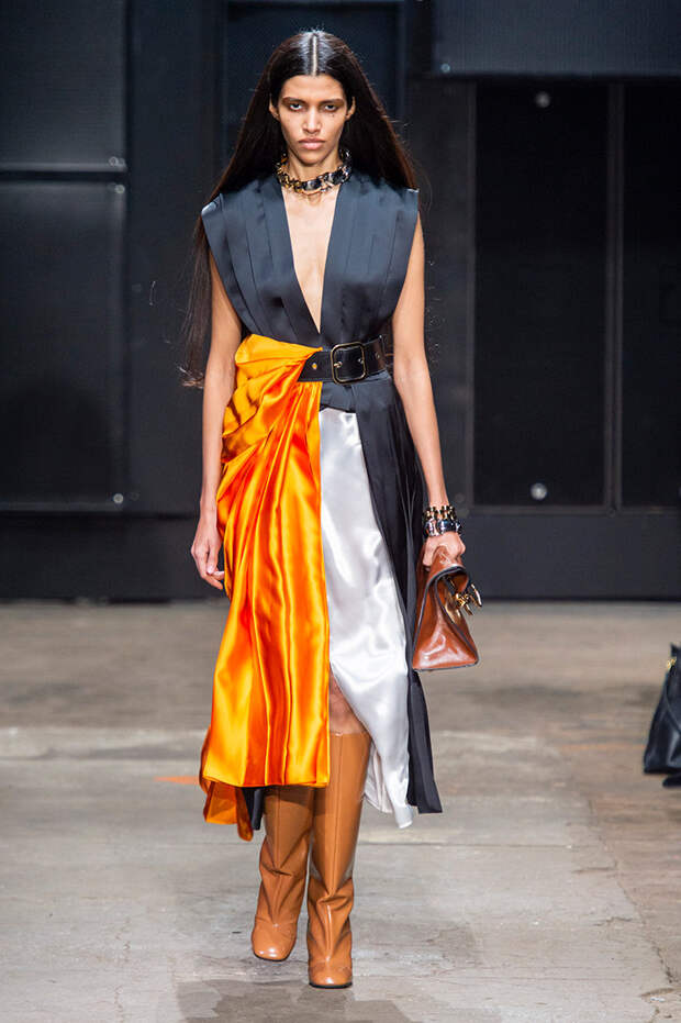 Мы же ограничимся основными тэгами: эротика, гормоны, борьба за сексуальную свободу как еретичество, противостояние рационального и чувственного, «карта точек удовольствия».Да, это еще одна коллекция, исследующая человеческую — в первую очередь женскую — сексуальность. В некотором роде более предсказуемая, чем у Симон Роша, в Лондоне работавшей с той же темой, и, тем более, чем у Кристофера Кейна. Риссо использовал и БДСМ-отсылки, и будуарную эстетику — все визуальные элементы, которые традиционно достаются наружу, когда нужно показать секс. Но банальной и скучной ее не назовешь никак. Здесь нет вызывающе глубоких декольте, "неожиданных", а на самом деле очевидных разрезов — это все было бы совсем не в духе странного, всегда на своей волне дома Marni.