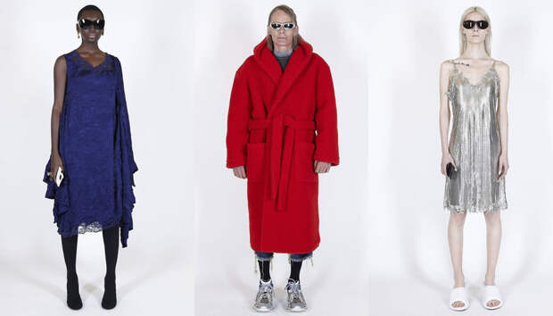Демне Гвасалии не привыкать иронично переосмыслять привычные атрибуты повседневности — он уже делал ботильоны с зажигалками вместо каблуков и серьги с крышками от пластиковых бутылок. Логично, что после затянувшегося карантина, он, как и большинство его коллег, решил обратиться к теме домашней одежды.