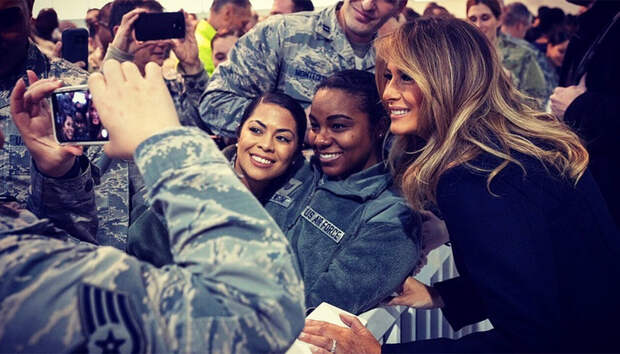 Перед Рождеством у Мелании Трамп насыщенный график: вчера первая леди США вместе с семьями военнослужащих помогла Санта-Клаусу упаковать подарки для детей из малоимущих семей, а теперь отправилась с визитом на военную базу в штат Виргиния. Встречающие специально для почетной гостьи устроили небольшую экскурсию, где она смогла близко рассмотреть истребители, побывать на авианосце «Джордж Буш» и поблагодарить военных за службу, а заодно пообщалась с детьми из местных школ.