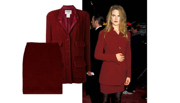 Например, в 1992 году Николь Кидман на премьере "Нескольких хороших парней", где сыграл ее бывший супруг Том Круз, появилась в двойке глубокого винного оттенка с приталенным жакетом. Дополнили его черные колготки и туфли на небольшом каблуке. Рассмотрите юную Николь и обязательно запишите такой костюм в список покупок.