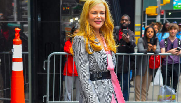 До выхода нового сезона сериала «Большая маленькая ложь» остались считанные дни, о чем вчера в эфире телевизионного шоу «Good Morning America» напомнила исполнительница одной из главных ролей Николь Кидман. Для визита на ТВ стилисты подобрали актрисе образ в самом актуальном цветовом сочетании сезона: нежно-розовое шелковое платье с бантом и ассиметричным подолом дополнил строгий серый жакет в клетку глинчек.