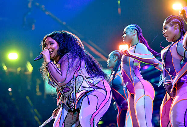 В этом году мероприятие поддержало бодипозитивное движение — эпатажным танцем церемонию открывала певица Lizzo. Она «зажгла» на сцене в нюдовом облегающем комбинезоне с неоновым рисунком. Выглядело очень зрелищно.