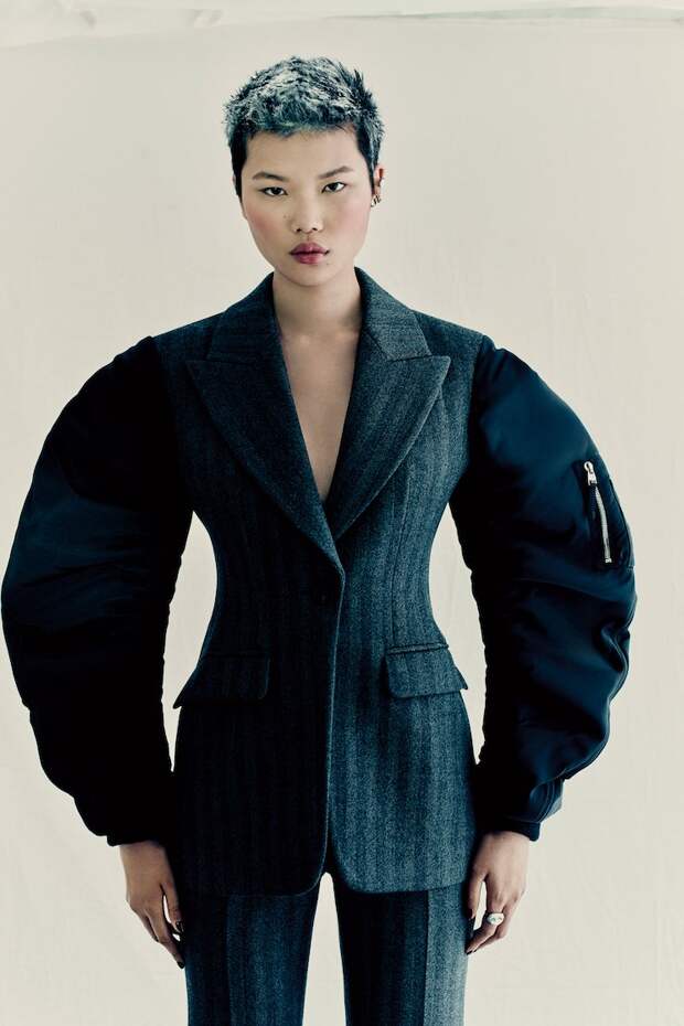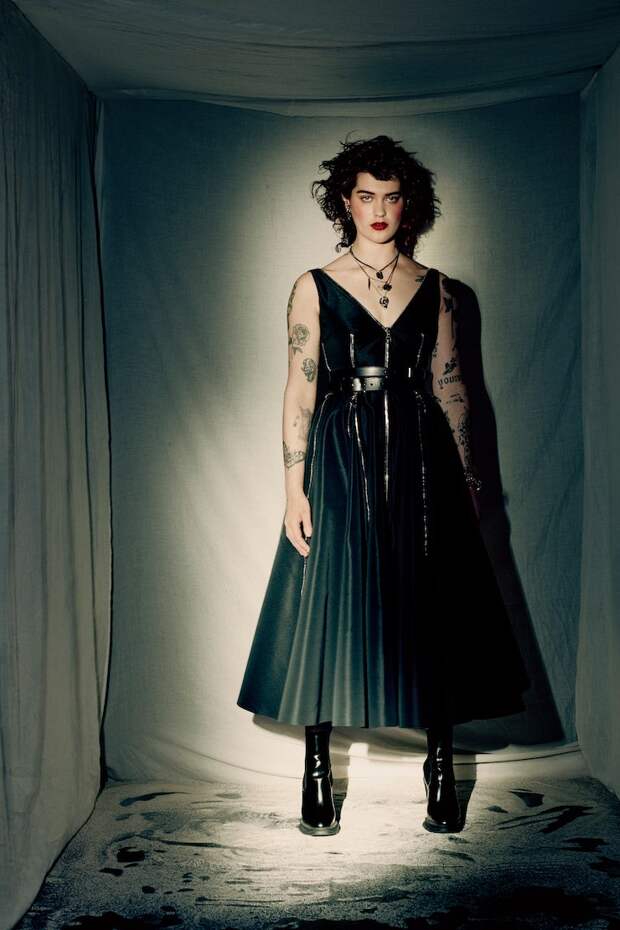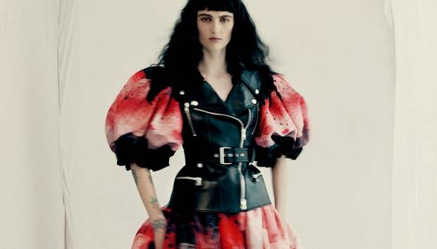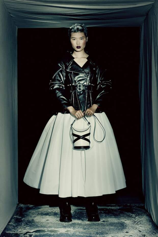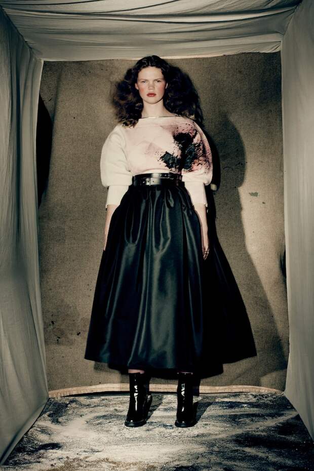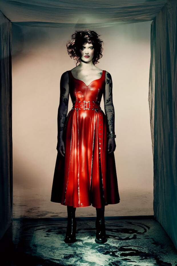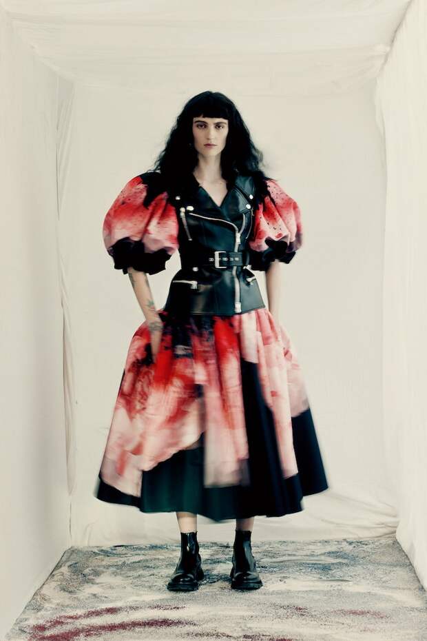 Впрочем, несмотря на такой трогательный референс, свойственная бренду воинственность тоже никуда не ушла. Кожаные платья, моментами напоминающие кольчуги, те самые принты с алыми анемонами, издалека похожие на разводы то ли краски, то ли вовсе крови, могучие округлые плечи, затянутые корсетами талии, — жесткость (и даже агрессия) в коллекции контрастирует с мягкостью юбок-пачек и рукавов-фонариков. Женщина Alexander McQueen одинаково готова и к балу, и к полю боя, если понадобится. Впрочем, будем надеться, что поводы будут находиться лишь для балов — в наше время как никогда хочется спокойствия.