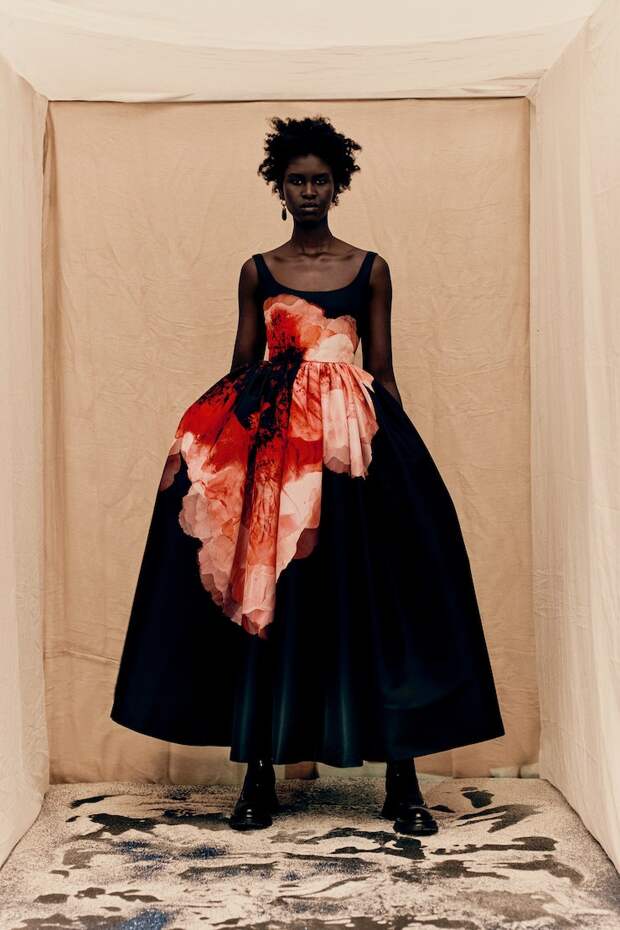 За первые отвечают принты в виде анемонов — любимых цветов дизайнера. Для их создания Бертон разрезала фото анемонов, складывала заново и фотографировала в таком деконструированном виде. Чтобы стратегически расположить их на обильно драпированных пышных юбках (тоже весьма напоминающих бутоны весенних цветов), понадобилось много времени, сноровки и мастерства. Но уж последнего Саре не занимать — кто еще из дизайнеров может похвастаться 13-летним опытом работы бок о бок с самим Ли Маккуином?