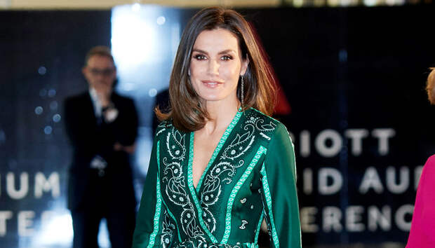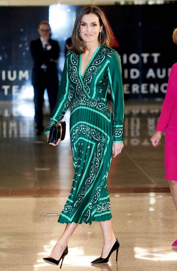 За выходами королевы Летиции интересно следить ничуть не меньше, чем за героинями светской хроники, а порой и полезнее — например, благодаря ей мы узнали, как деликатно вписать ультрамодный коралловый оттенок в деловой гардероб. А вчера супруга короля Филиппа VI продемонстрировала эффектный вечерний образ: она посетила вечер в честь 80-летия издания Marca в Королевском театре в Мадриде и по этому поводу выбрала изумрудное платье Sandro с юбкой плиссе, лодочки Prada в черном цвете и клатч Nina Ricci — королевский выход!
