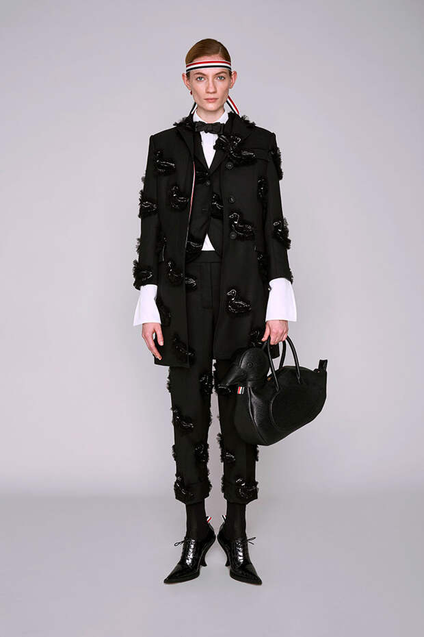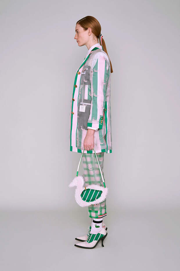 Представлены образцовые костюмы и комплекты: прямые юбки и пиджаки "учительницы", полуспортивные куртки, словно мерч колледжа, твидовые шорты и пальто в клетку и даже строгий бушлат. Платья и костюмы "наездницы" дополнены длинными кожаными сапогами. Об инфантильности всех вещей говорят сумки, выполненные в форме животных — уток и собак, а также гольфы с контрастными полосами и треники. При этом классический стиль всех вещей нарочито усилен, чтобы в итоге они смотрелись не только элегантно, но и иронично.