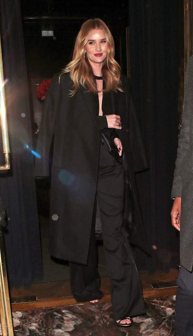 Для особого вечера Роузи выбрала провокационный total black - свободные гаремные шелковые брюки, блузу с опаснейшим декольте-чокером и босоножки на тонких ремешках. Чтобы скрыть все вырезы по дороге в такси, она набросила на плечи классическое черное пальто в мужском стиле.