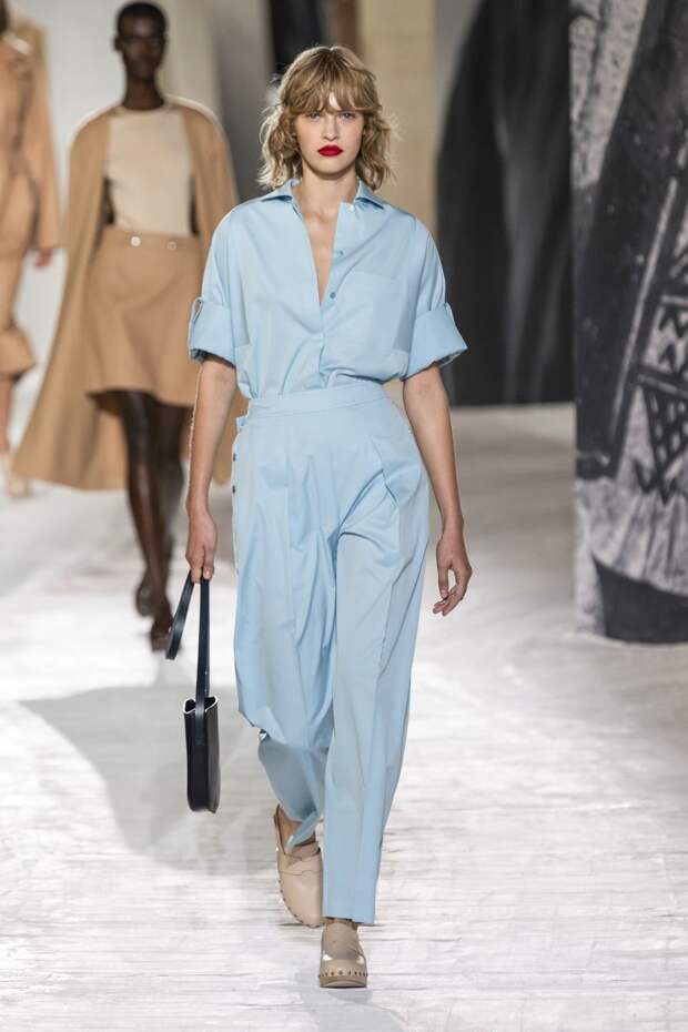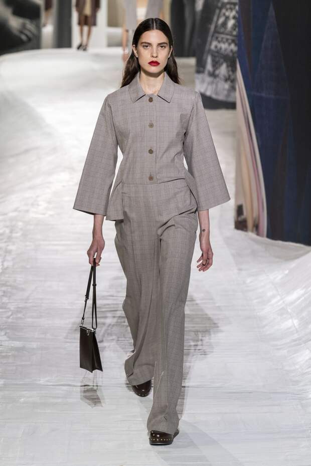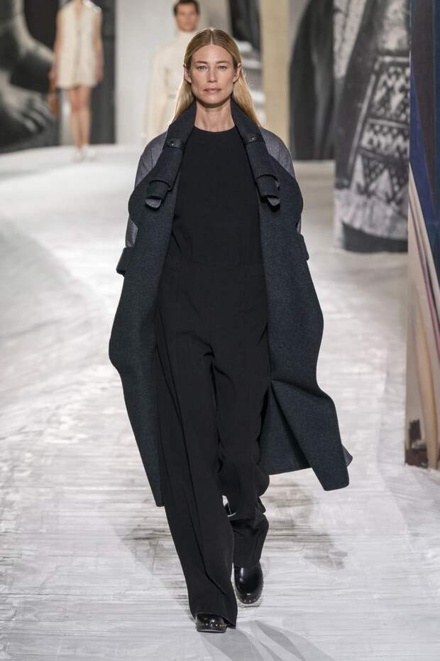 Первое, что бросается в глаза при просмотре  — тотальный монохром. Практически все луки выполнены целиком и полностью только в одном оттенке. Сам выбор цветов тоже практически пуританский: небесно-голубой, бежевый, серый, белый, черный. Лишь к середине показа, будто языки пламени, неожиданно возникают яркие всполохи красного и оранжевого. Это максимум накала и драмы, которые допускает в этот раз Ване-Цыбульски. В остальном — абсолютное, практически медитативное спокойствие. Все линии в коллекции плавные, силуэты — простые, без многослойности и лишних деталей кроя. Удивительно простой стайлинг с абсолютным минимумом аксессуаров тоже обращает на себя внимание: большинство луков дополнены лишь обувью (клогами — дизайнер вдохновилась Голландией?) и изредка — сумками (среди которых вы не увидите ни одной знаковой Birkin или Kelly). Никаких украшений, платков и даже ремней — ничего лишнего. Только чистые силуэты и легкие цвета.