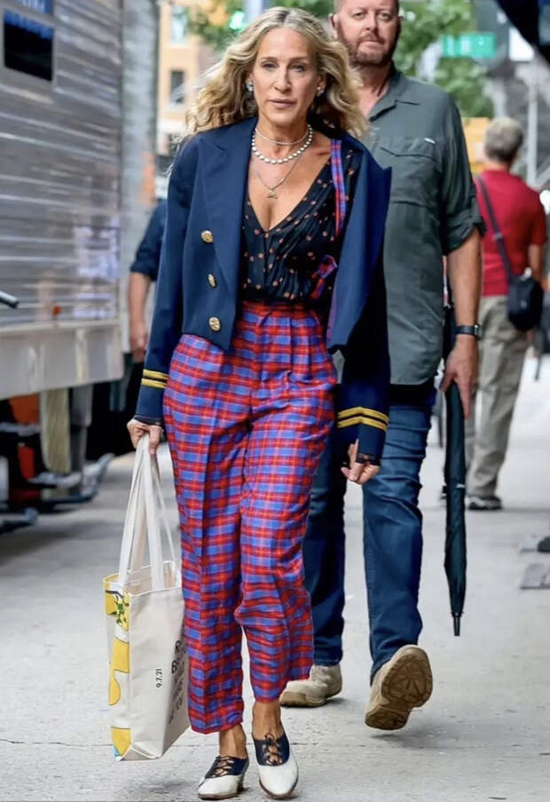 На недавних снимках со съемочной площадки актрисе пришлось появиться в образе, который можно отнести к категории рискованных. Сочетание несочетаемого — привычный для ее героини путь, но иногда это получается совсем уж на грани. Так, на съемках она была замечена в блузе в горошек, ярких клетчатых брюках с подтяжками и укороченном жакете с широкими плечами в стиле милитари (он чем-то напоминал концертные костюмы Майкла Джексона). Образ завершили черно-белые балетки. Сочетание горошка и клетки само по себе довольно рискованно — а с жакетом, похожим на винтажную военную форму, становится и того опаснее. Но любимой героине мы можем простить все — хотя бы за ее смелость.