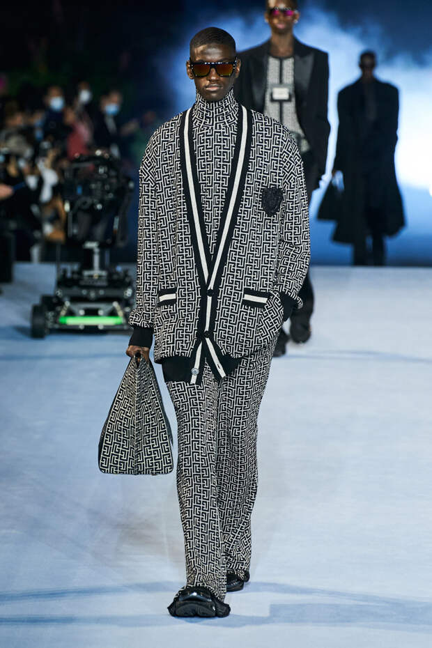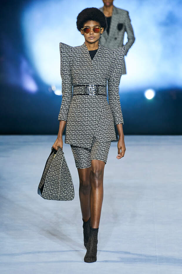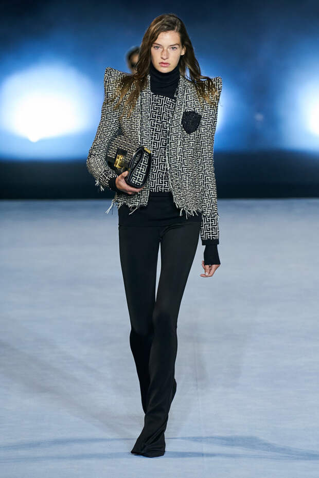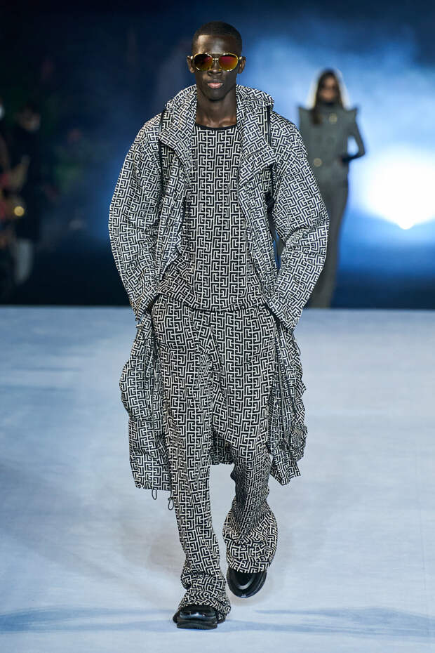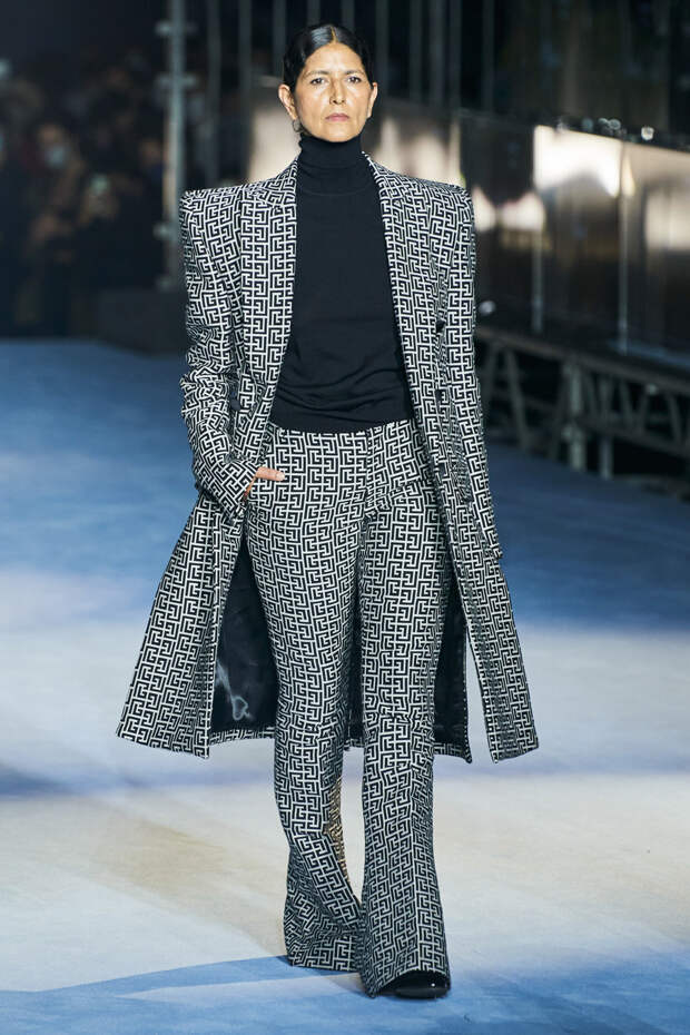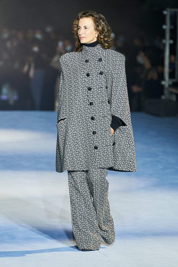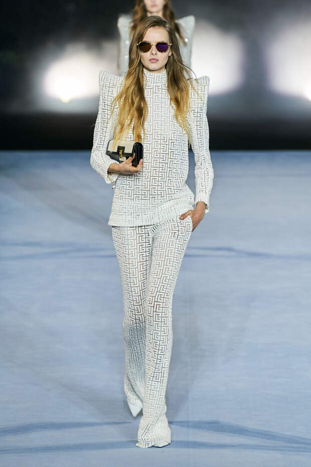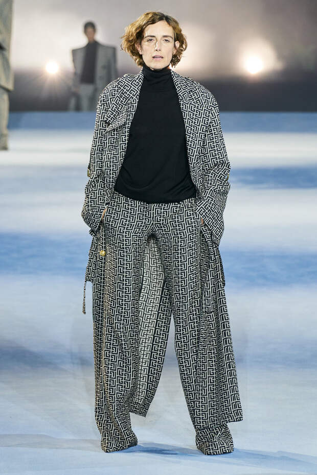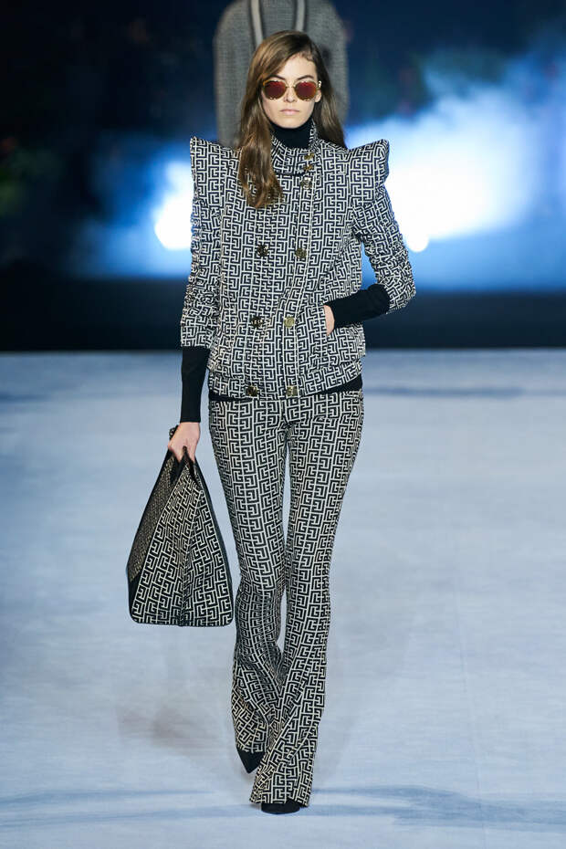 Еще одна важная находка этого сезона у Balmain — архивный принт с монограммой, вдохновленной парижскими садами-лабиринтами, который использовал Пьер Бальман в 70-х.