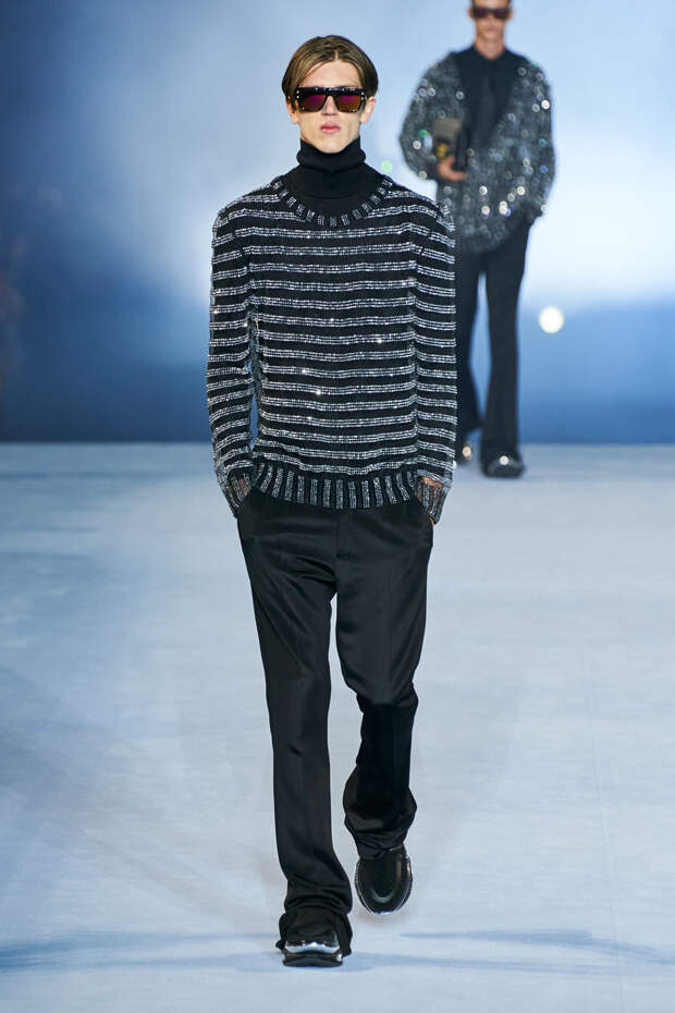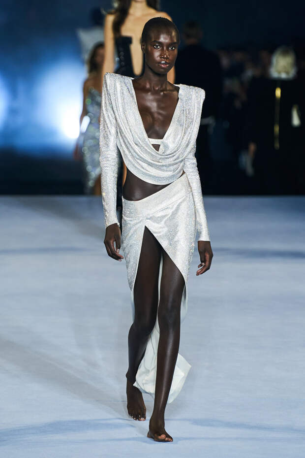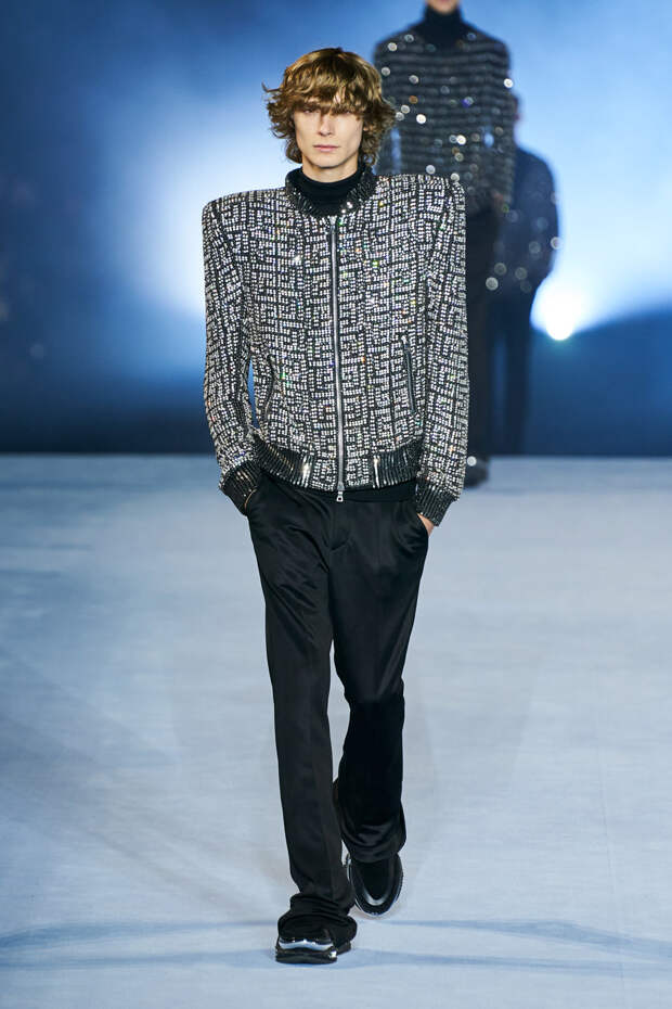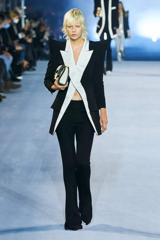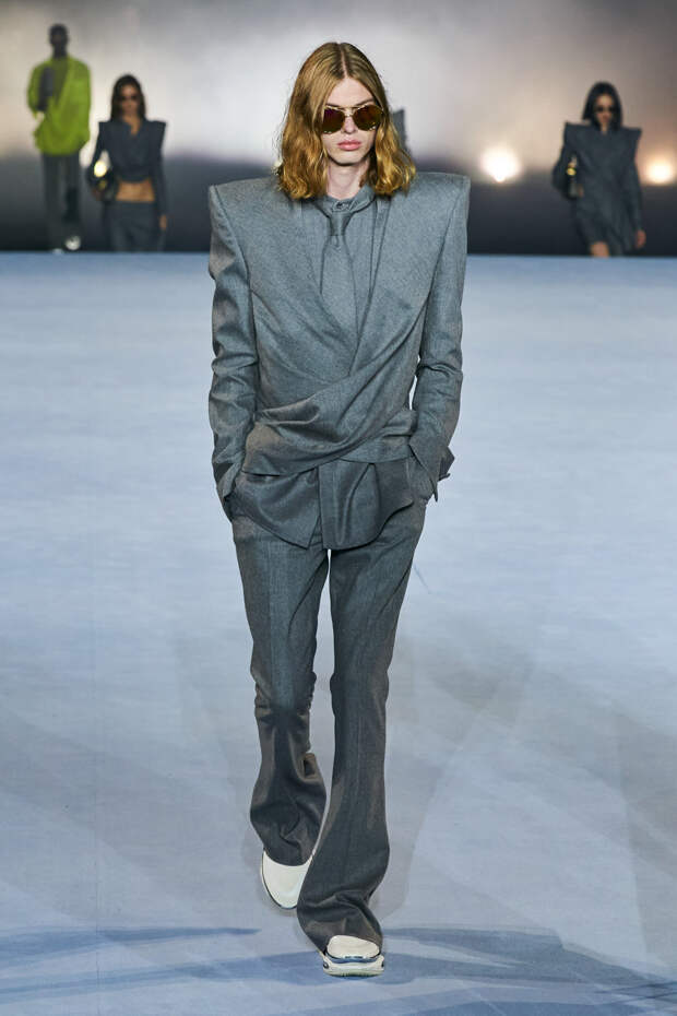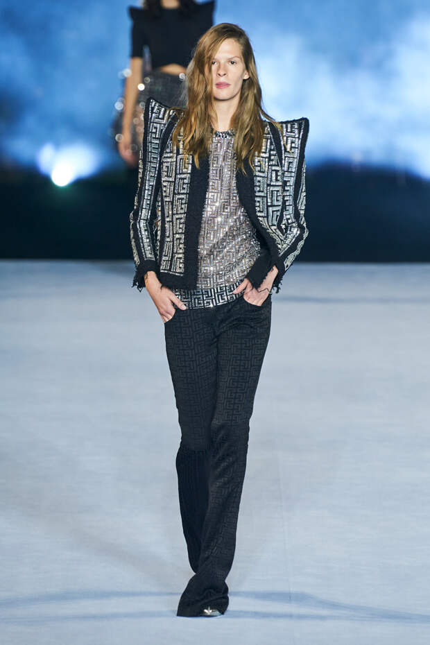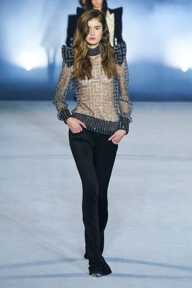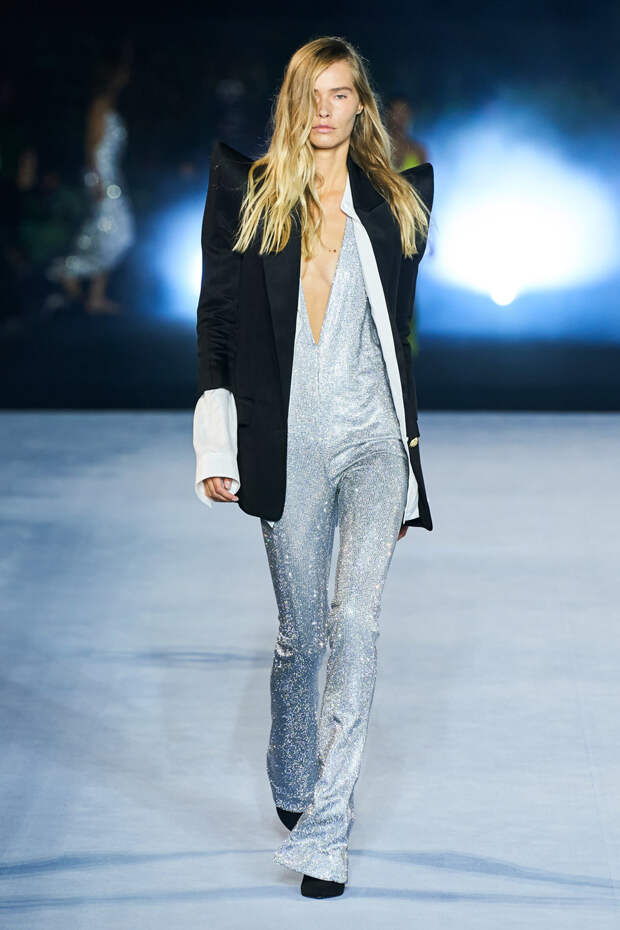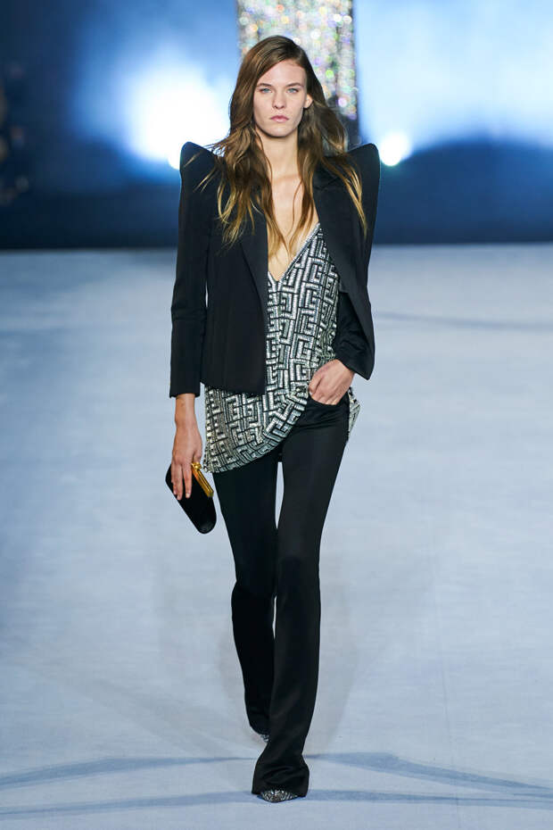 Конечно, Оливье Рустен остался верен своей любимой эстетике 80-х. Центральным элементом коллекции стали огромные гипертрофированные плечи. На этот раз — острые и приподнятые, местами они были практически цитатой Пьера Кардена и его знаменитого силуэта Pagoda shoulders, которые в прошлом сезоне уже повторил Демна Гвасалия для Balenciaga. Этот элемент появился практически во всех луках и стал частью жакетов, платьев и топов. Конечно, такая деталь сразу задает настроение и формирует весь силуэт — острый во всех смыслах. Второй повторяющийся паттерн — брюки клеш с низкой посадкой, обычно в паре все с теми же жакетами с огромными плечами. Где-то к середине шоу наконец возникает третий "кит", на котором стоит вся коллекция: блеск. Глиттер, кристаллы и пайетки всегда были излюбленными материалами для Рустена, но в этот раз он использовал их особенно щедро, иной раз покрывая ими моделей практически с ног до головы.