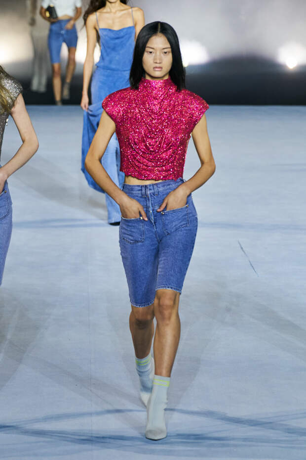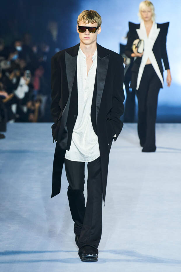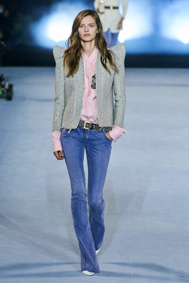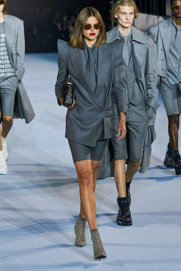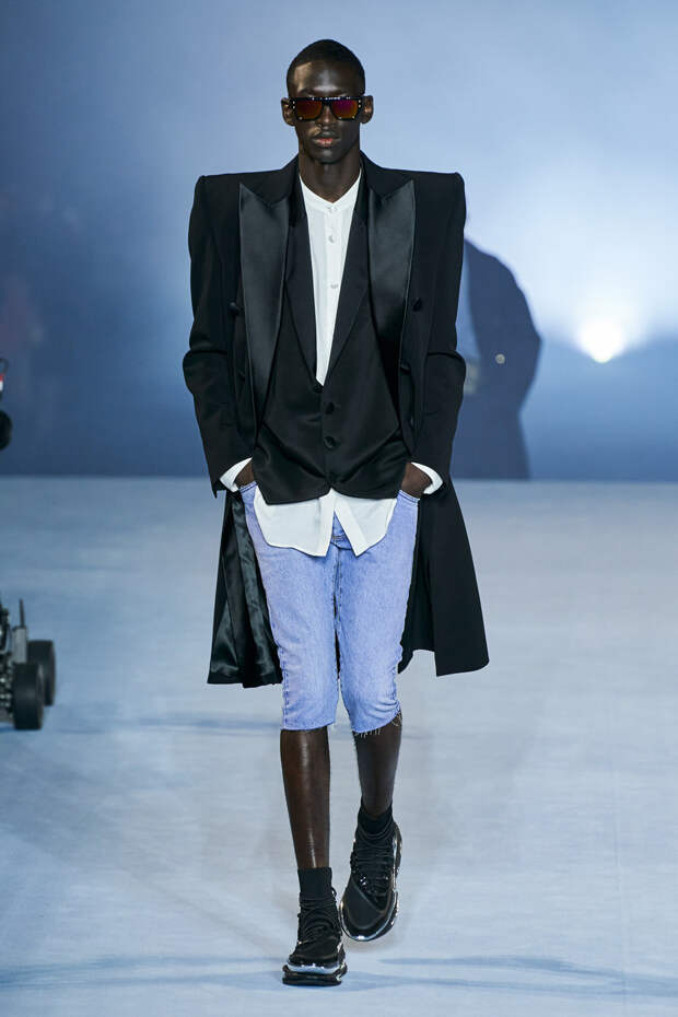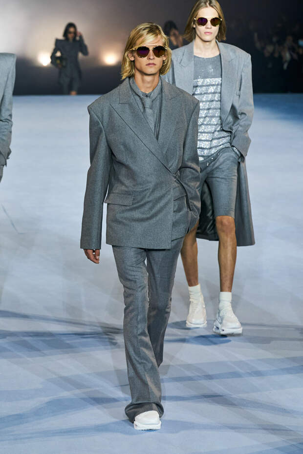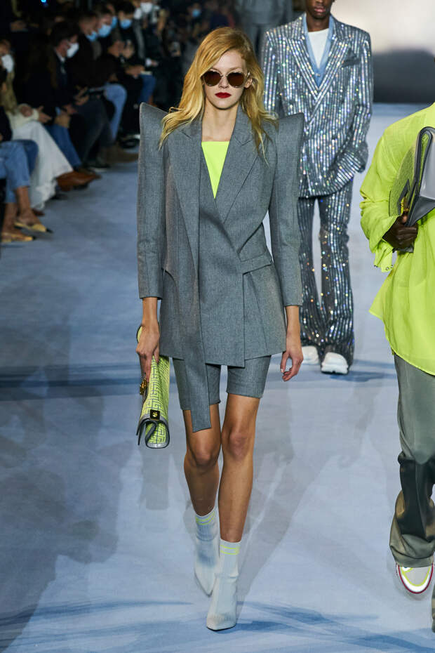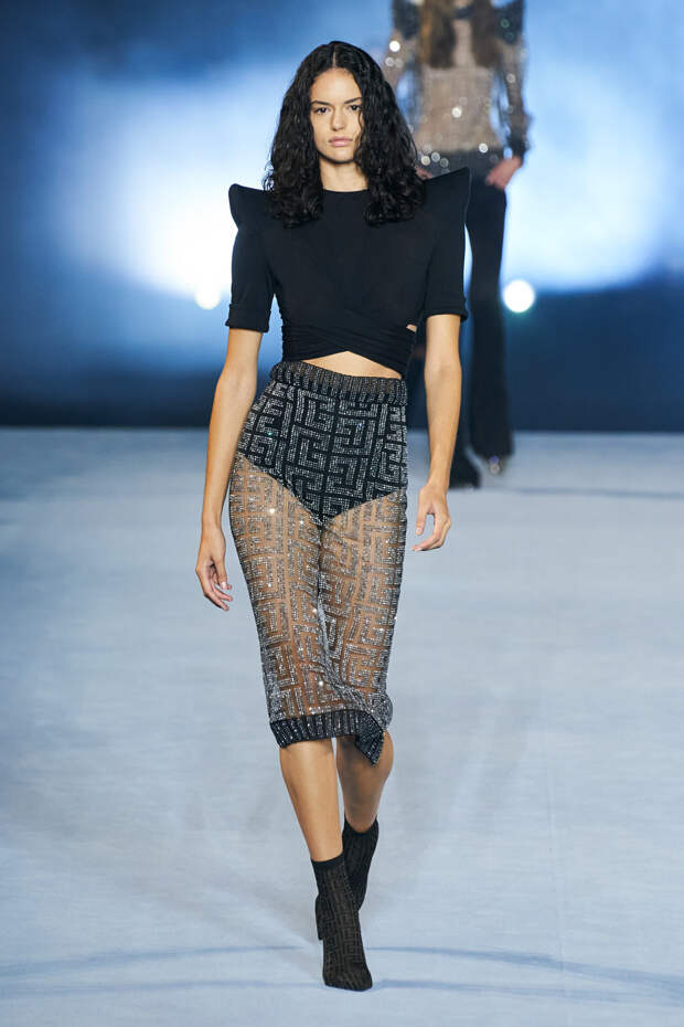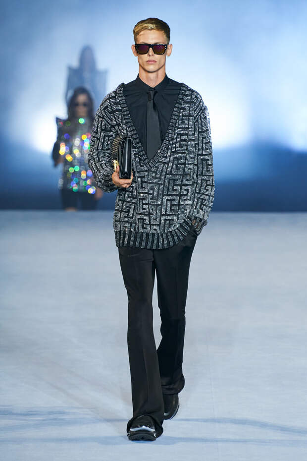 Конечно, Оливье Рустен остался верен своей любимой эстетике 80-х. Центральным элементом коллекции стали огромные гипертрофированные плечи. На этот раз — острые и приподнятые, местами они были практически цитатой Пьера Кардена и его знаменитого силуэта Pagoda shoulders, которые в прошлом сезоне уже повторил Демна Гвасалия для Balenciaga. Этот элемент появился практически во всех луках и стал частью жакетов, платьев и топов. Конечно, такая деталь сразу задает настроение и формирует весь силуэт — острый во всех смыслах. Второй повторяющийся паттерн — брюки клеш с низкой посадкой, обычно в паре все с теми же жакетами с огромными плечами. Где-то к середине шоу наконец возникает третий "кит", на котором стоит вся коллекция: блеск. Глиттер, кристаллы и пайетки всегда были излюбленными материалами для Рустена, но в этот раз он использовал их особенно щедро, иной раз покрывая ими моделей практически с ног до головы.