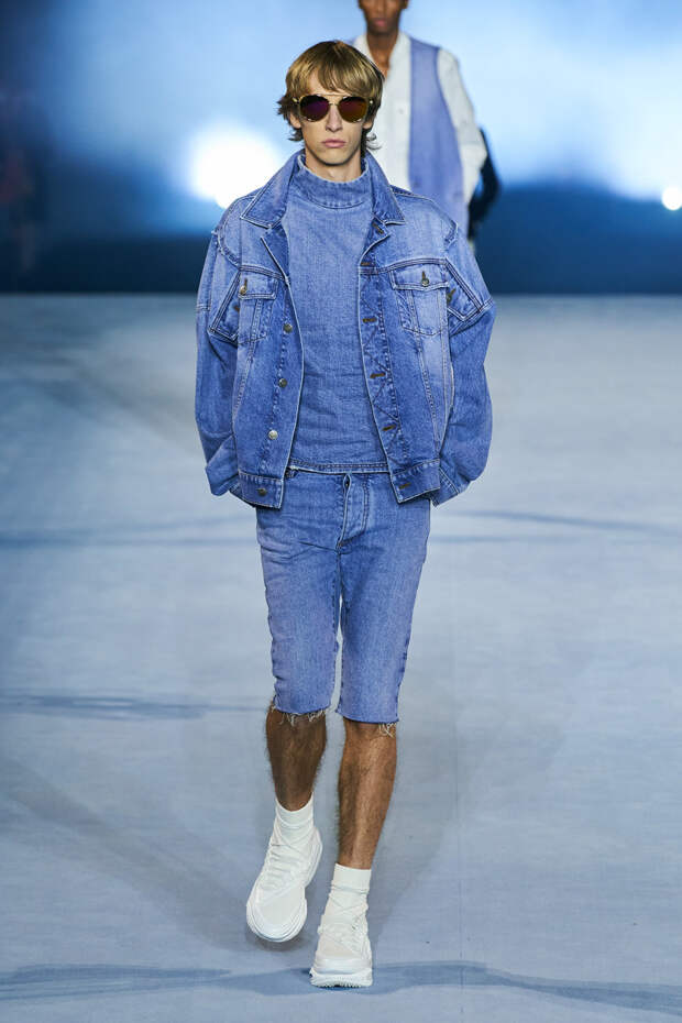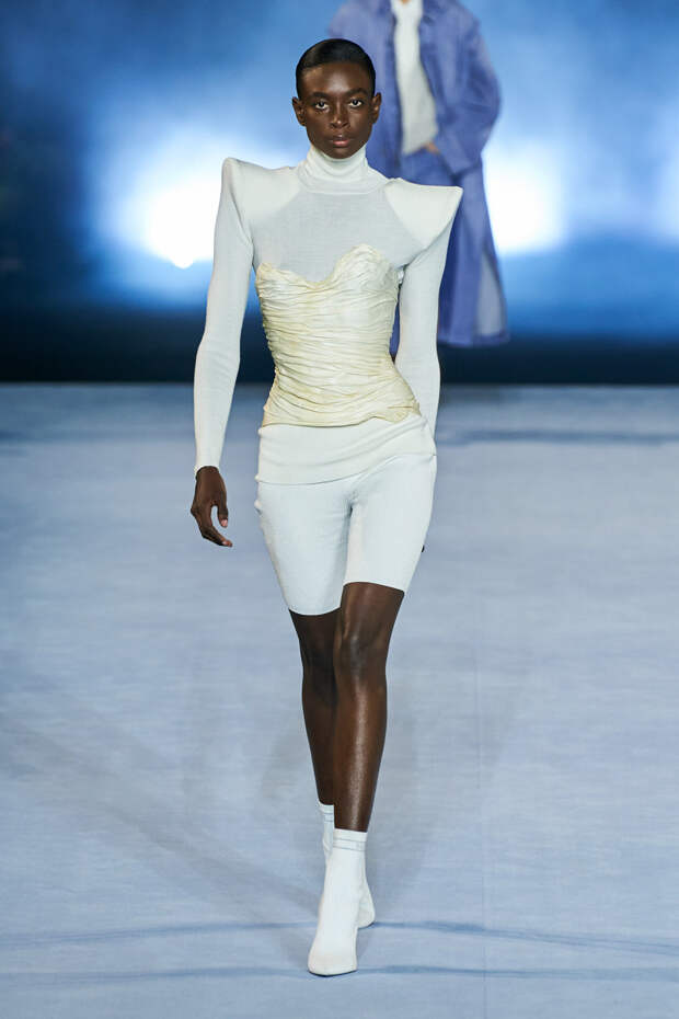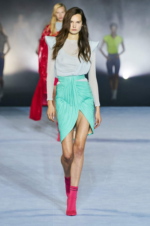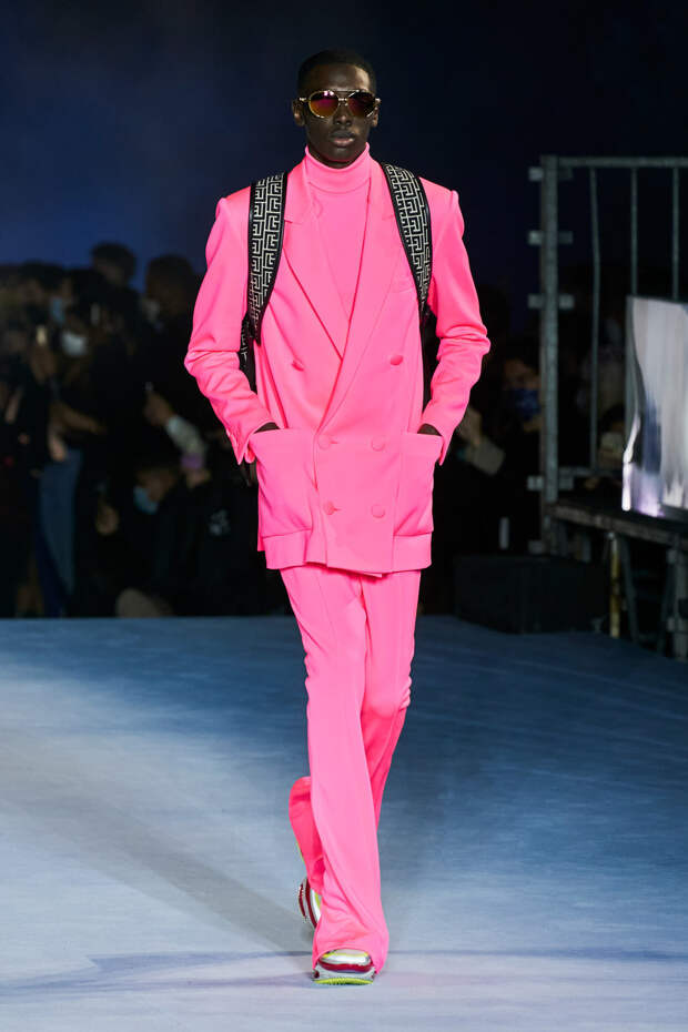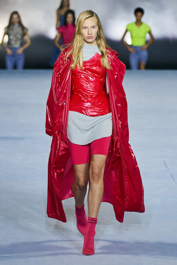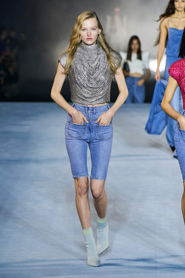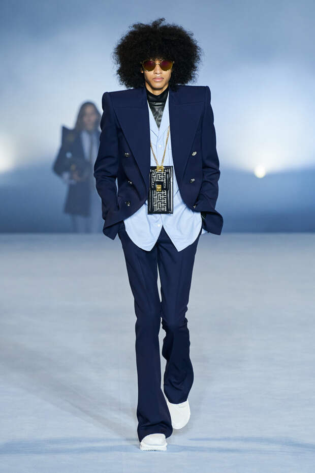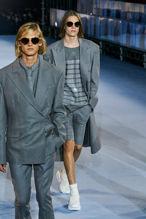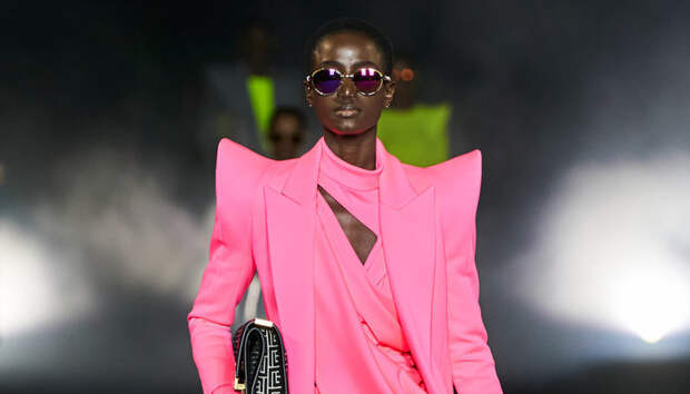 Конечно, Оливье Рустен остался верен своей любимой эстетике 80-х. Центральным элементом коллекции стали огромные гипертрофированные плечи. На этот раз — острые и приподнятые, местами они были практически цитатой Пьера Кардена и его знаменитого силуэта Pagoda shoulders, которые в прошлом сезоне уже повторил Демна Гвасалия для Balenciaga. Этот элемент появился практически во всех луках и стал частью жакетов, платьев и топов. Конечно, такая деталь сразу задает настроение и формирует весь силуэт — острый во всех смыслах. Второй повторяющийся паттерн — брюки клеш с низкой посадкой, обычно в паре все с теми же жакетами с огромными плечами. Где-то к середине шоу наконец возникает третий "кит", на котором стоит вся коллекция: блеск. Глиттер, кристаллы и пайетки всегда были излюбленными материалами для Рустена, но в этот раз он использовал их особенно щедро, иной раз покрывая ими моделей практически с ног до головы.