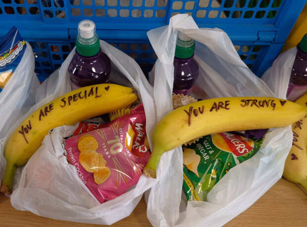 Меган, под шерстяным пальто которой пряталось черное шифоновое платье Oscar de la Renta с принтом в виде райских птиц, единорогов и других фантазийных персонажей, решила заглянуть на кухню — именно там волонтеры собирают посылки с ланчами для своих подопечных. Герцогиня предложила оставить на бананах вдохновляющие надписи и подписала фрукты: "Ты особенная", "Ты сильная", "Ты смелая" — однажды Маркл уже видела этот прием на школьных обедах, и он запомнился ей своей простотой и потрясающим эффектом. Уверены, многим женщинам это послание от герцогини придется по душе.While packing lunches for @One25Charity‘s outreach service, The Duchess of Sussex had an idea to write positive messages on banana skins... pic.twitter.com/Fwm6arfc25
