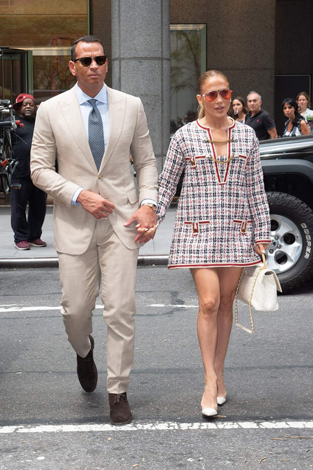 Любимую пару всего Нью-Йорка (и не только) Дженнифер Лопез и Алекса Родригеса поймали за оживленным спором. Что бы ни произошло между влюбленными, они держались за руки, да и в гармоничности их отношений сомневаться не приходится. Это уже второй выход пары за неделю в сочетающихся образах. Светлый костюм и голубая рубашка Алекса перекликались с рисунком твидового платья Gucci, которое выбрала певица.