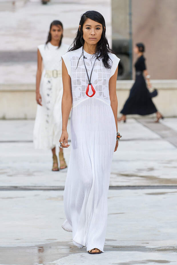 Новая весенне-летняя коллекция Chloé не стала исключением. Чтобы усилить этот эффект, дизайнер выпустила моделей в одежде нового сезона на улицы. Буквально: трансляцию показа предваряло видео с девушками, идущими по Парижу. Надо сказать, смотрелось это очень органично: ничего не выдавало в них моделей, одетых в вещи с подиума. Будто вполне реальные парижские модницы просто решили выйти на прогулку. Когда же показ наконец начался, стало понятно, что первое впечатление не было ошибочным. Открыла шоу модель в объемном асимметричном платье бледно-розового цвета с плиссированной вставкой сбоку. В таком запросто можно отправиться куда угодно: на свидание, вечеринку или открытие выставки модного художника. И, что самое важное, при этом вам будет максимально комфортно.