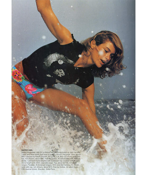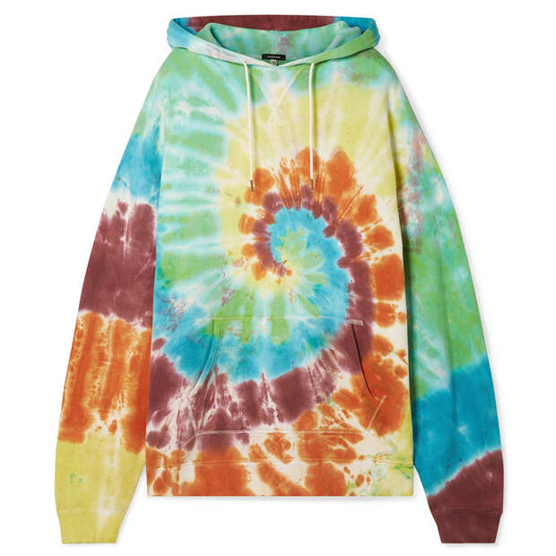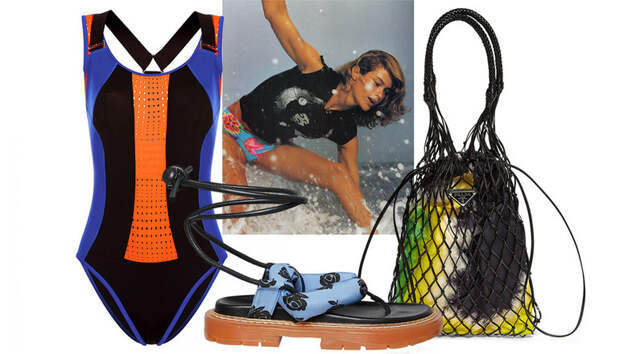 Берем уроки серфинга у любимых дизайнеров и выходим сухими из воды в спортивных купальниках, толстовках с рисунком тай-дай и балетках, похожих на коралловые тапочки. Сочетайте худи психоделической расцветки с черными шортами, а яркий купальник носите вместо боди с широкими брюками.