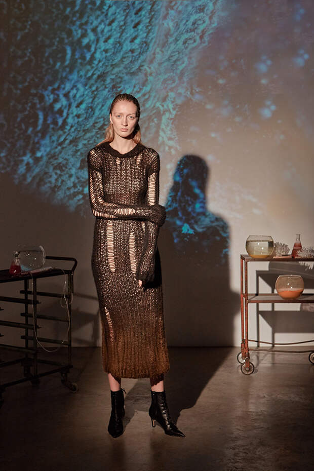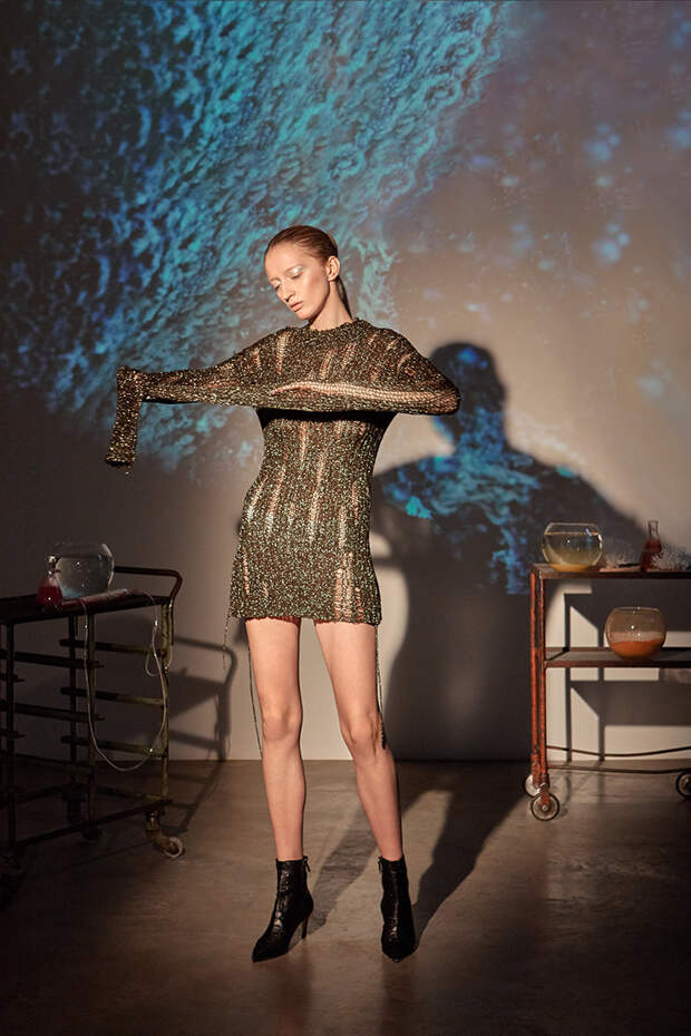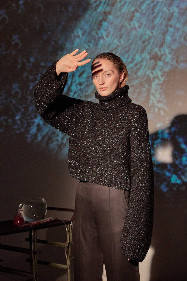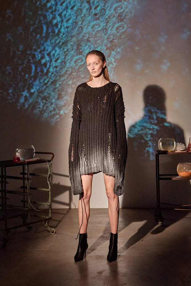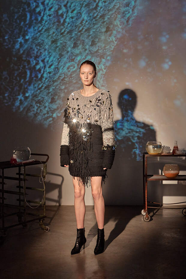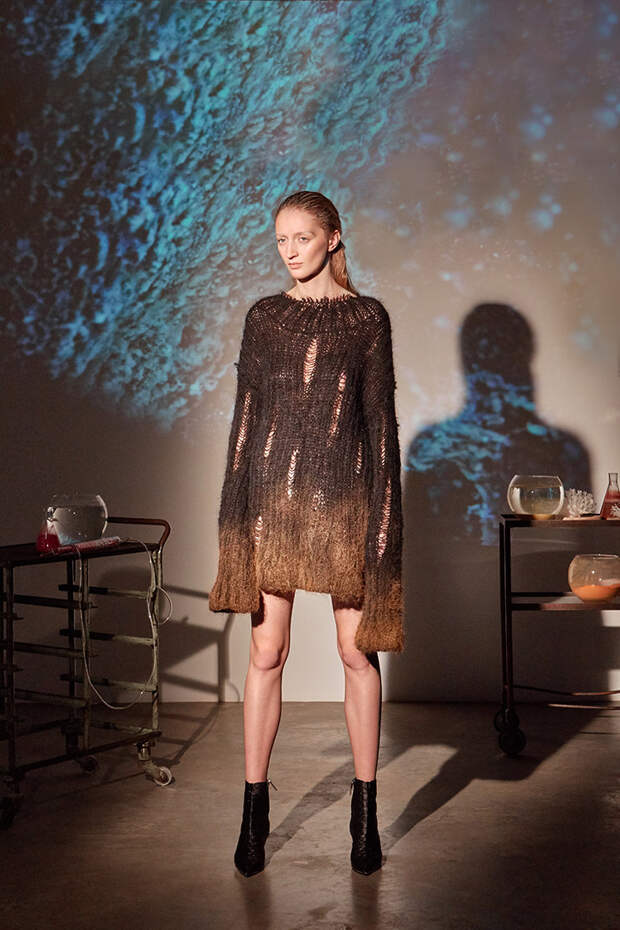 Лейтмотивом стала тема морской фауны. Сексуальные мини-платья, сшитые будто из блестящих водорослей, и объемные свитеры с градиентом, похожим на пену от волн, - такие наряды созданы для уютной зимы, но всегда будут напоминать о бушующем океане и свежем бризе.