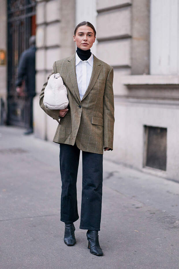 Мерзнете и любите кутаться в несколько слоев сразу? То, что нам нужно: надеваем топ или водолазку, сверху сорочку, застегнутую на все пуговицы, а уж на них блейзер или жакет свободного кроя. Тепло, нескучно и в гармонии с самыми последними тренлами — Виктория Бекхэм точно одобрила бы ваш выбор.