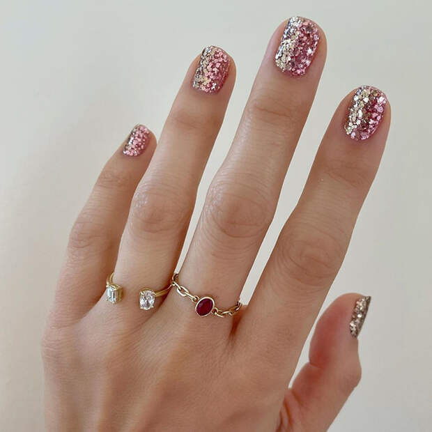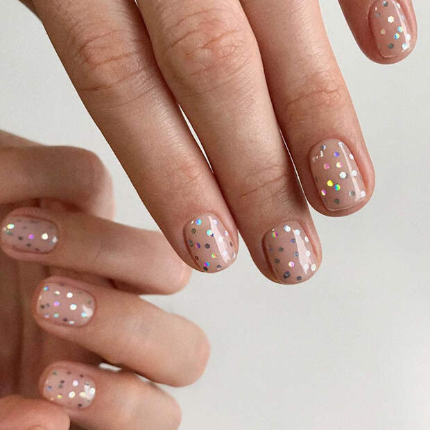 Но все же, главный тренд в новогоднем маникюре - это блестки, именно они остаются фаворитом для многих уже который год. Глиттер может быть самым разнообразным: крупным и мелким, цветным или монохромным - особое внимание обратите на оттенок белый металлик (о мнению астрологов, они принесет удачу в наступающем году белого металлического быка). За основу такого маникюра советуем взять прозрачный лак — так маникюр будет выглядеть более сдержано и актуально.