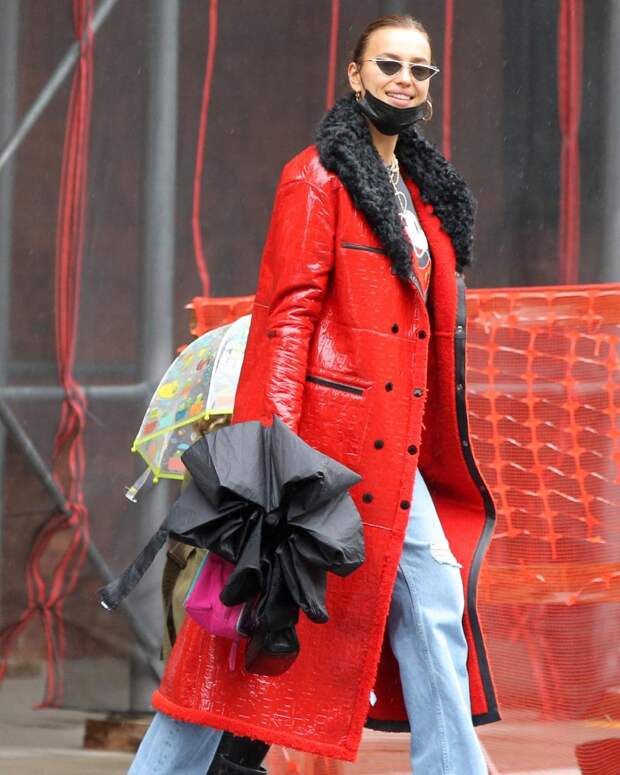 Ирина надела ярко-красный лаковый плащ с черным меховым воротником — вещь, которая уже сама по себе создает образ. Однако она решила не останавливаться на одной яркой детали — и дополнила ее футболкой с Микки Маусом. Таким образом она поддержала большой тренд на «детские» вещи (о нем мы уже писали). Ну а широкие светлые джинсы с прорезями на коленях и массивные ботинки на толстой подошве — уже известные фавориты модели, которых она часто выбирает для своих повседневных выходов. Завершающая деталь — аккуратные солнцезащитные очки и несколько цепочек на шее, которые эффектно наслаиваются одна на другую (как их сочетать — читайте здесь).