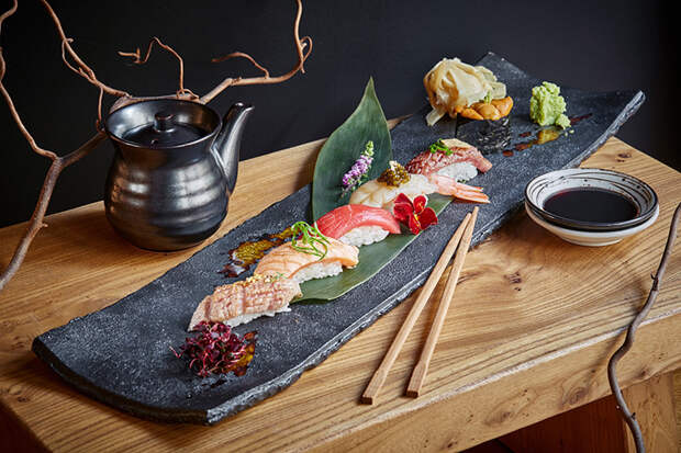 И немного о красивой жизни. В SHIBA, не так давно открывшемся на Патриках японском ресторане Аркадия Новикова, запустили новый сет с черной икрой и сусальным золотом. Всего в сете шесть видов суши. Обожженный торо (брюшко тунца) декорируется лепестками сусального золота, обожженный лосось оттеняется соусом тартар и юдзу, тунца сопровождают трюфельным маслом, а сладкую креветку ботан – черной икрой. Японская мраморная говядина вагю идет с чесноком, икра морского ежа – с водорослями. Сет стоит 4000 руб.