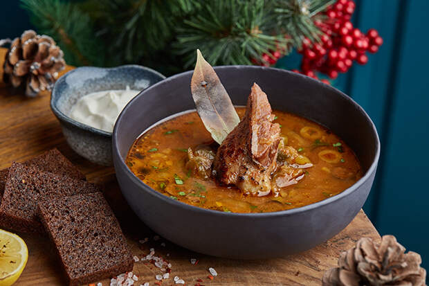 Это паштет из гуся с мягкими тостами бриошь, солянка с подкопченным гусем, пирог с птицей и грибами, папарделле с домашней тушенкой из гуся, гусиная ножка с хурмой в ягодном соусе. Мясо гуся, кстати, тут коптят в собственной коптильне. А если у вас намечается домашняя вечеринка, рождественского гуся весом под три кило можно заказать домой целиком. Главное, сделать это заранее - за три дня. Стоимость - 4500 руб.