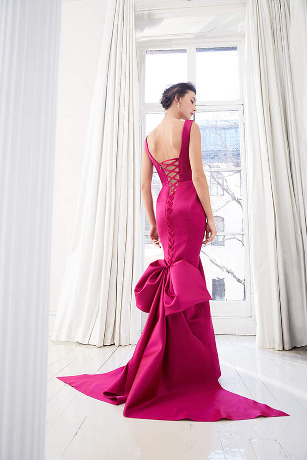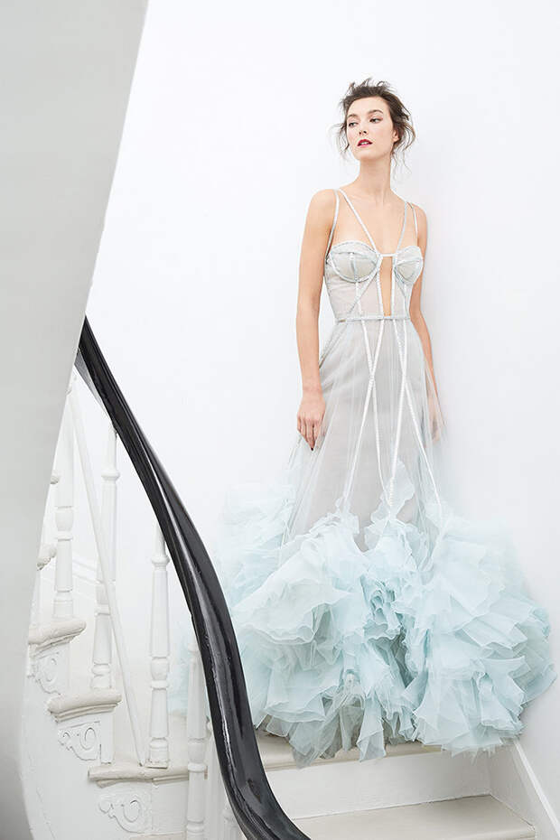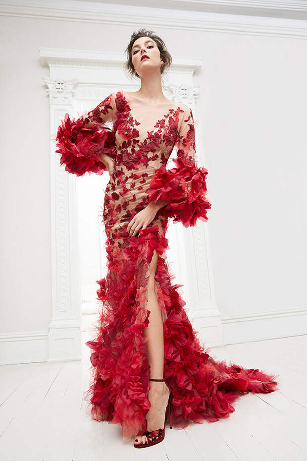 На этот раз Джорджина придала им ноту 80-х, создав каскады пышной атласной тафты и перья из цветов, которыми декорированы рукава полупрозрачных моделей. Коллекция, достойная див в душе.