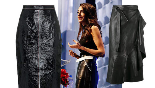 Одним из образцов ее вкуса стал дуэт из трикотажного топа и черной кожаной юбки с контрастным белым поясом — в нем Амаль приняла участие в ежегодной конференции о правах женщин, прошедшей в Массачусетсе.Нам приглянулись и цвет, и фактура юбки, и мы решили собрать для вас самые эффектные и одновременно универсальные черные юбки из кожи, чтобы вы легко создавали образы для будней и особых поводов.