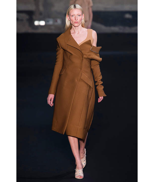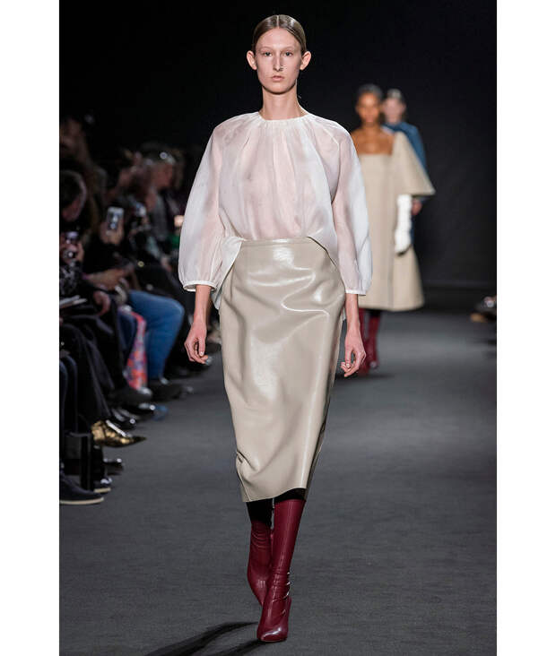 Как и ее минималистские образы – свободные рубашки с подвернутыми рукавами, заправленные в широкие юбки A-силуэта, плиссированные платья без принта и твидовые жакеты нейтральных цветов.