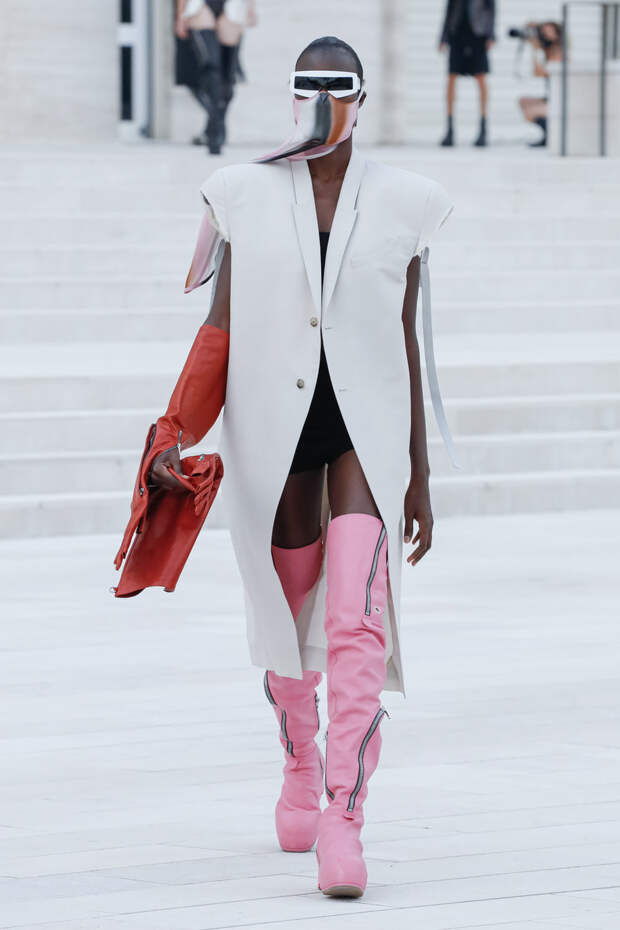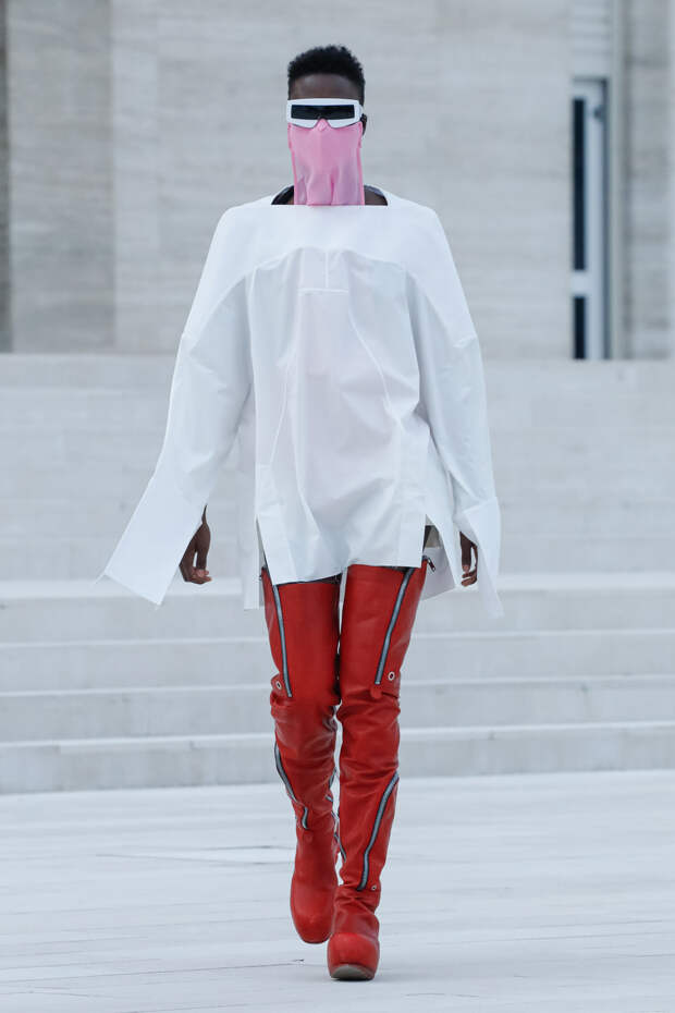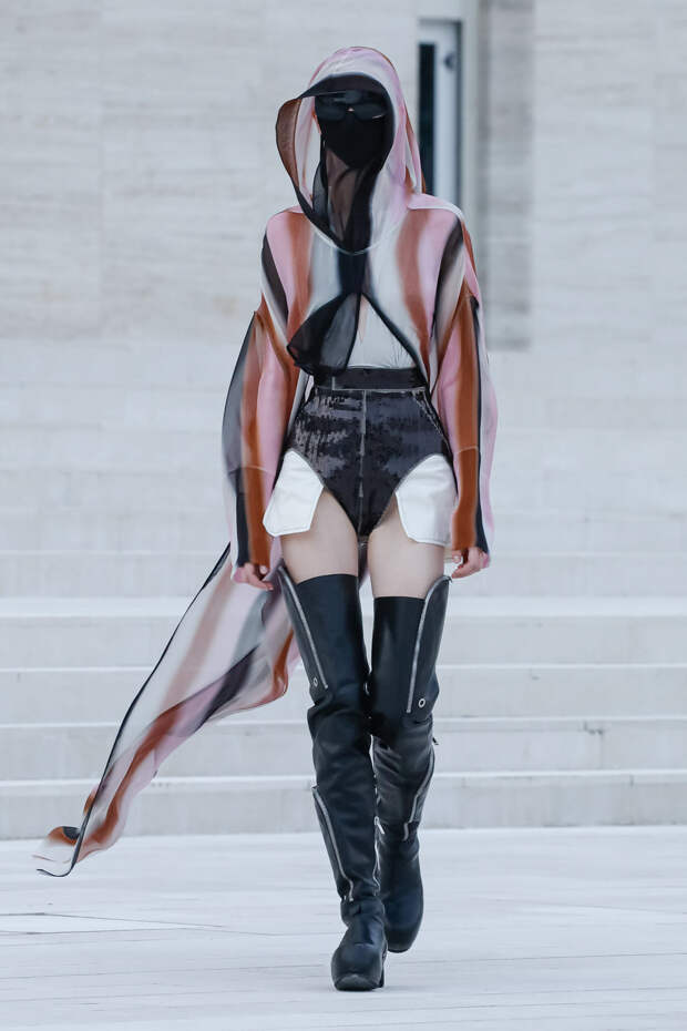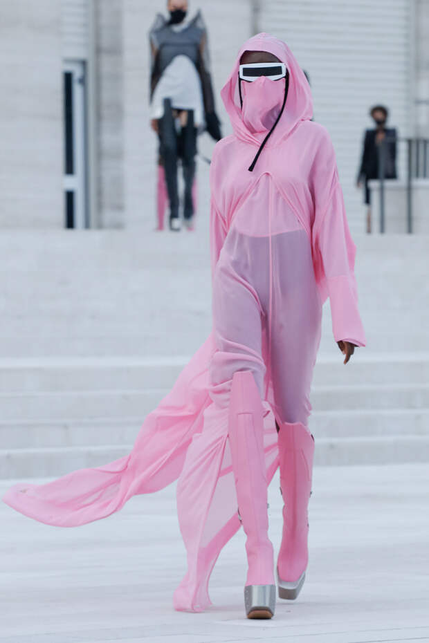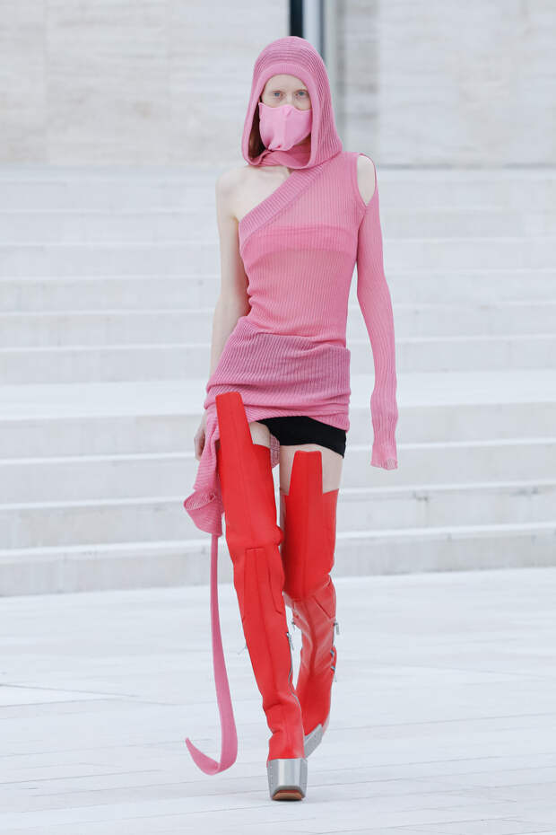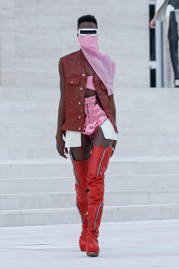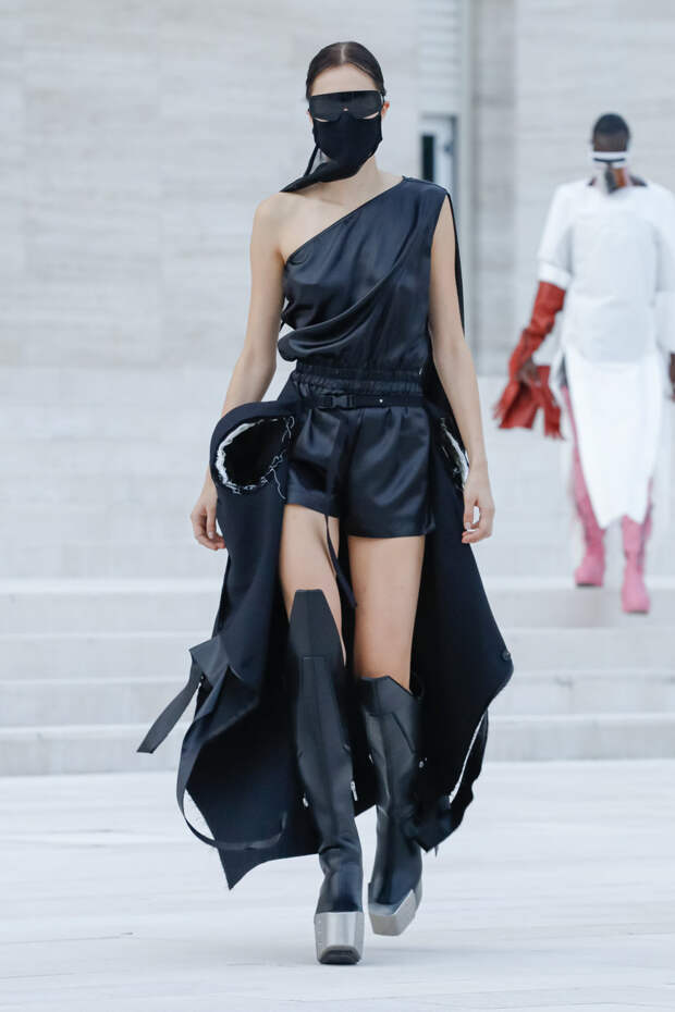 В аннотации к показу сам Оуэнс использовал фразу "мрачное веселье". Пожалуй, этот оксюморон как нельзя лучше описывает его новый сезон. Несмотря на указанный источник вдохновления, частично коллекция вышла визуально куда более яркой, чем обычно. В ней непривычно много цвета (красного и, внезапно, розового) и блеска (когда вы еще видели микро-шорты в пайетках на показе Rick Owens?). В саундтреке при этом был использован ремикс на знаменитую песню Донны Саммер "I feel love" — кажется, коллекция могла бы выйти под альтернативным названием "Disco inferno". Впрочем, несмотря на неожиданные всполохи цвета, в целом шоу вышло традиционно ахроматическим — в любимой черно-белой гамме дизайнера.
