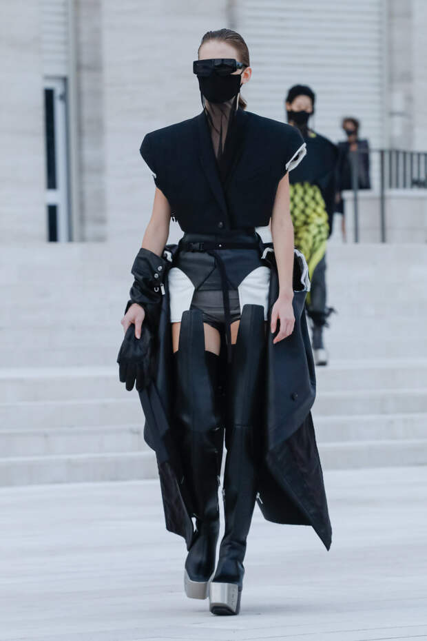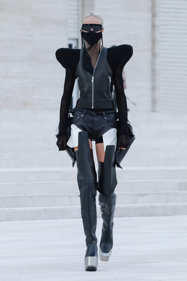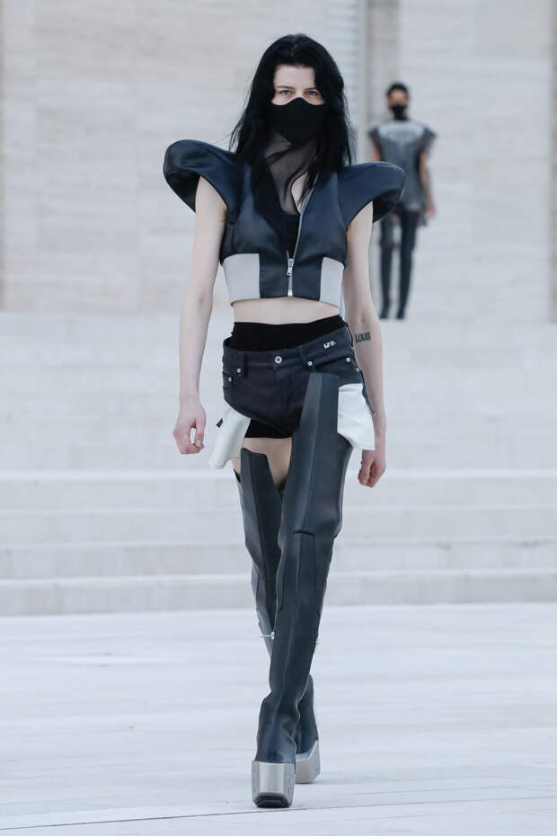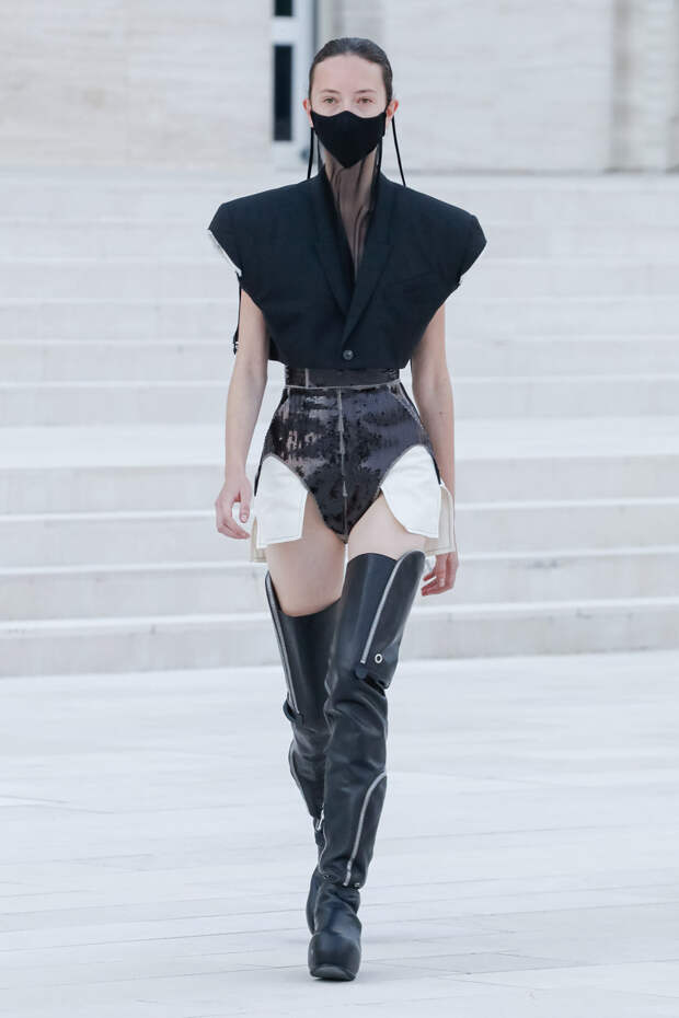 Три ключевых элемента и связующих звена между луками — огромные гипертрофированные плечи, ботфорты на впечатляющей платформе и маски — уже не только знаковый для Оуэнса аксессуар (они и раньше нередко появлялись в его шоу), но и неизбежный пост-ковидный атрибут. Не только в буквальном, но и в переносном смысле — как некое сообщение и правильный посыл для окружающих. В этом смысле он сравнил их с замысловатыми шляпками французских женщин времен Второй мировой — они использовали экстравагантные аксессуары как молчаливые насмешки над немецкими оккупантами.