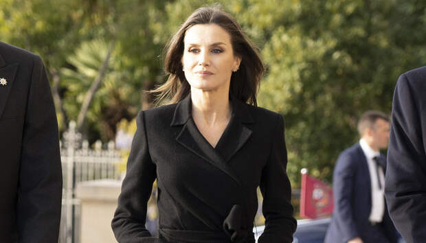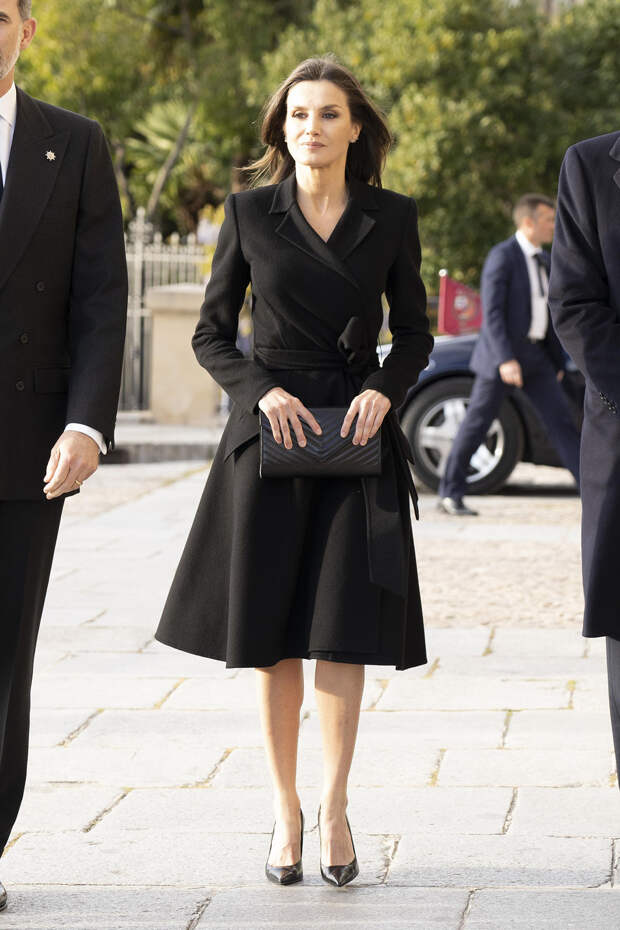 Иеронима в Мадриде, первая леди прибыла в черном пальто Carolina Herrera, лодочках от испанского бренда Magrit и с прямоугольным клатчем Felipe Varela. Все эти марки можно смело назвать любимыми для нашей героини, а вещи от Фелипе Варелы Летиция носит даже вопреки общественному мнению, несмотря на обвинения дизайнера в плагиате.