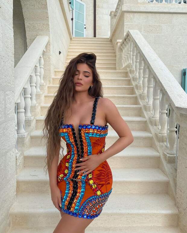 Платье с глубоким вырезом, украшенное крупными драгоценными синими, желтыми и красными камнями, идеально подчеркивало все соблазнительные изгибы фигуры Кайли. Дерзкое мини на бретельках, расшитых черными камнями, словно было создано именно для пышных форм нашей героини. Стилисты уложили локоны Кайли красивыми волнами, а ее бьюти образ остался неизменным - нюдовый макияж с акцентом на глаза.